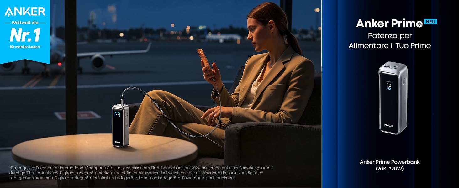 - Anker Prime Power Bank (20K, 220W), cavo di ricarica USB-C a USB-C da 3,3 ft (240W), custodia da viaggio, guida, garanzia di 24 mesi e la nostra assistenza clienti amichevole.