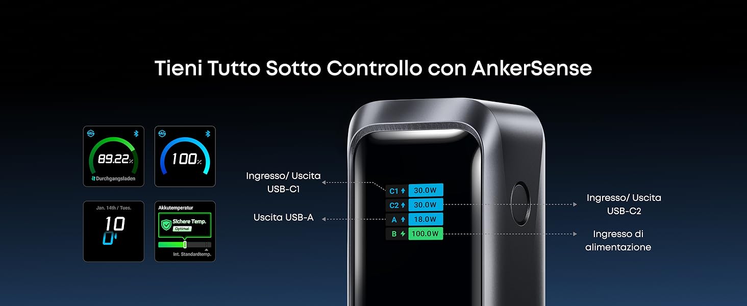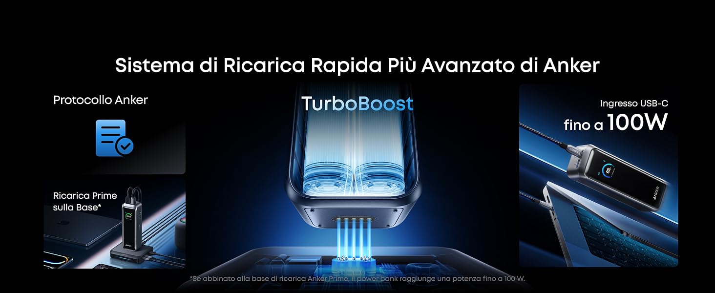- Ricarica ultraveloce da 100 W (max): Ricarica Anker Prime Power Bank fino al 50 % in 31 minuti tramite l’ingresso USB‑C con potenza massima da 100 W.