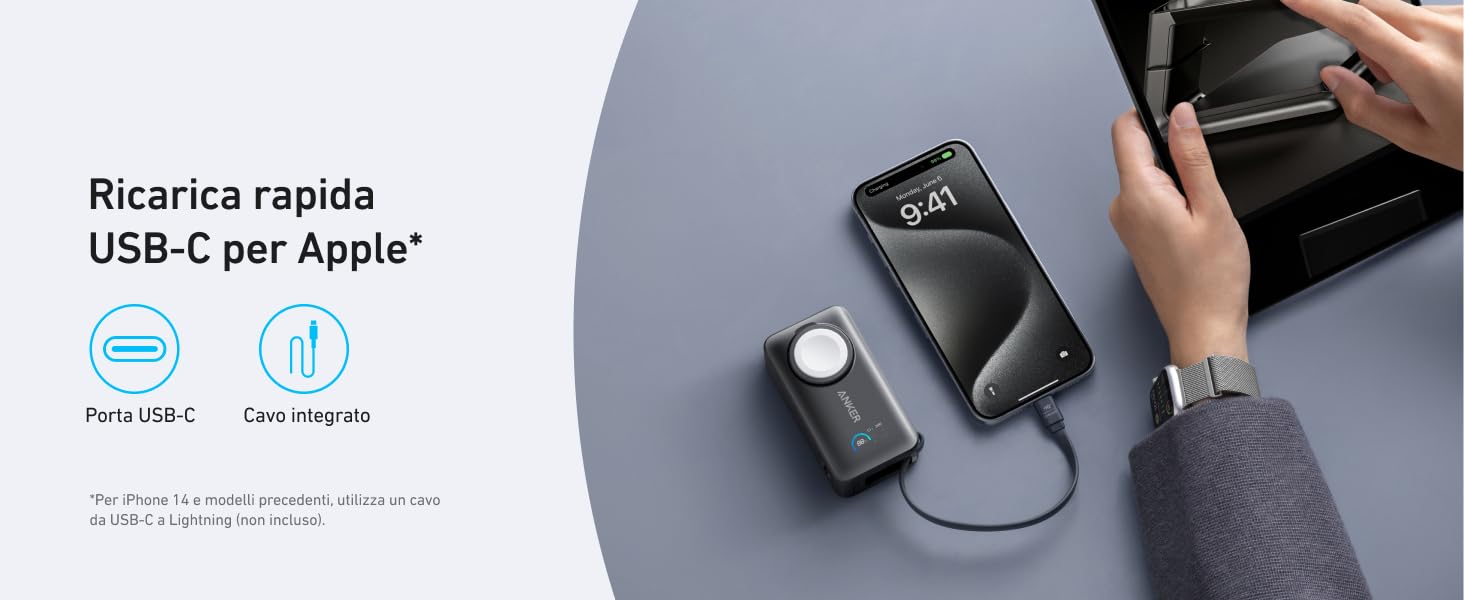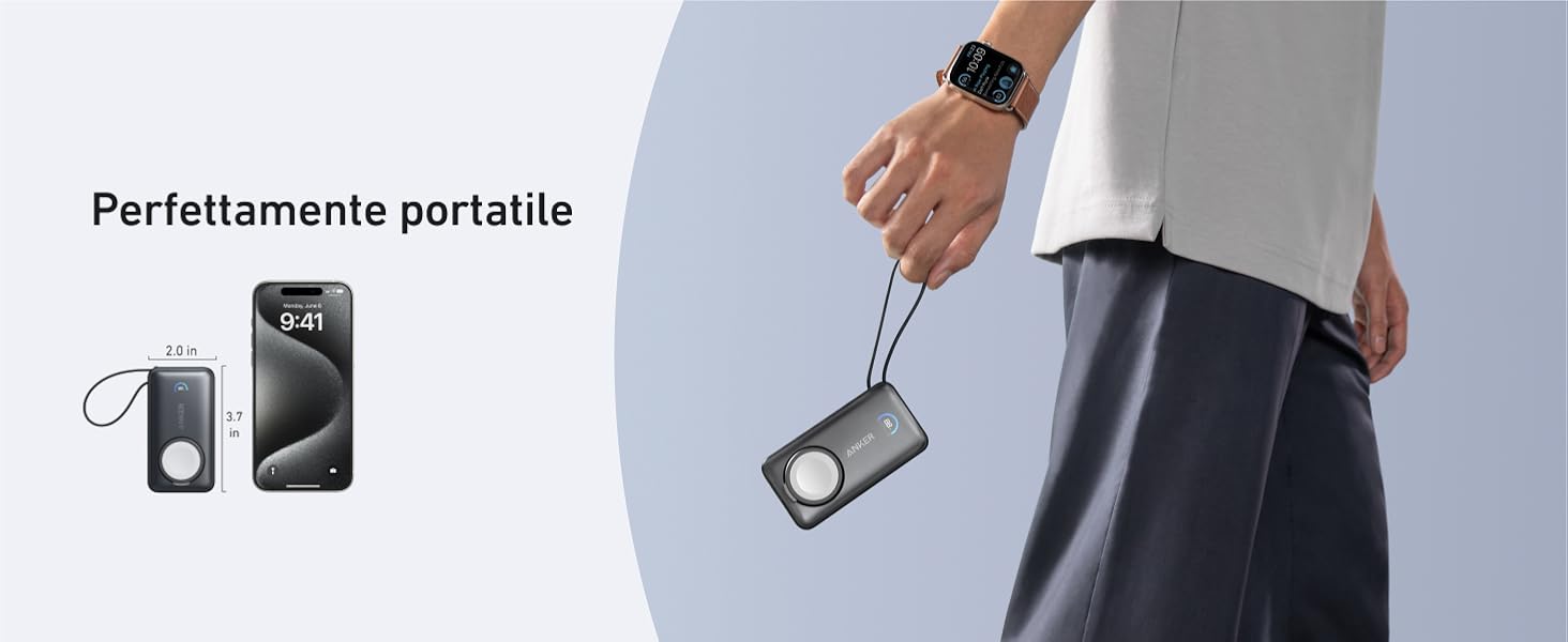 - Energia a portata di viaggio: Compatto come un mouse, con soli 95 × 51 × 32,4 mm, si adatta facilmente a tasche e borse. Approvato per i voli, il nostro power bank è la soluzione di ricarica perfetta per il viaggio: fornisce circa due ricariche complete per l'iPhone 15 Pro e fino a 11 ricariche per l'Apple Watch 9.
