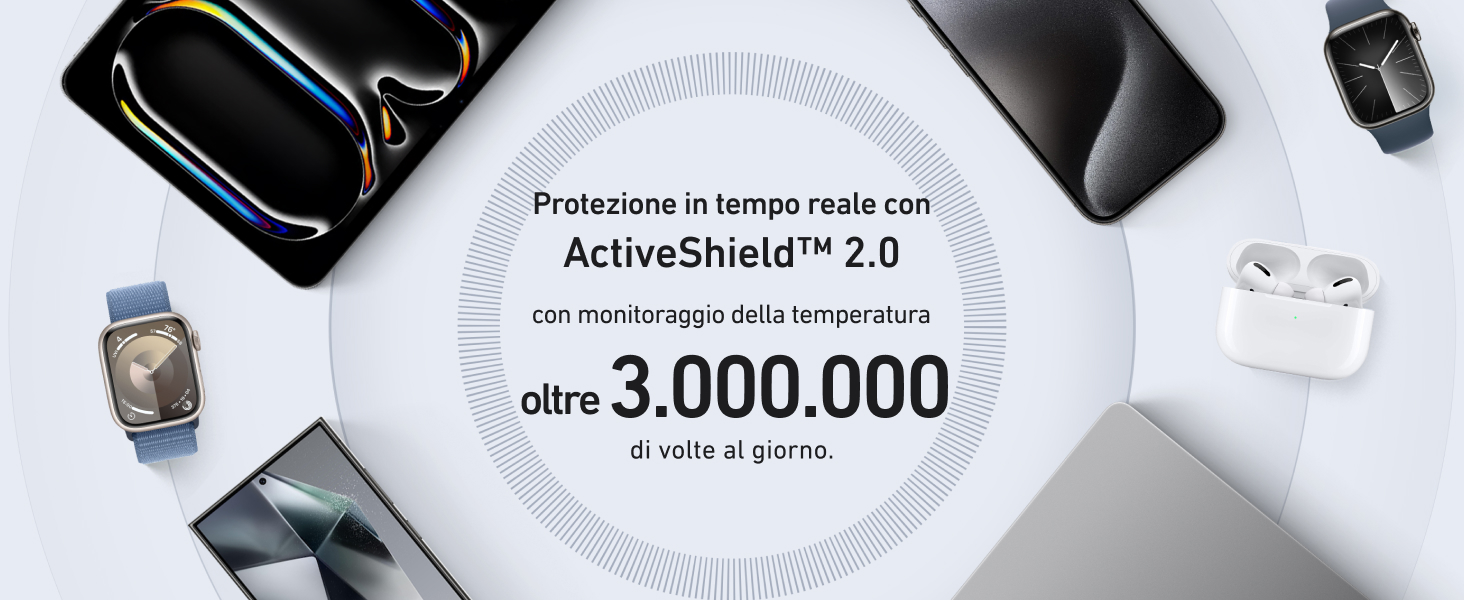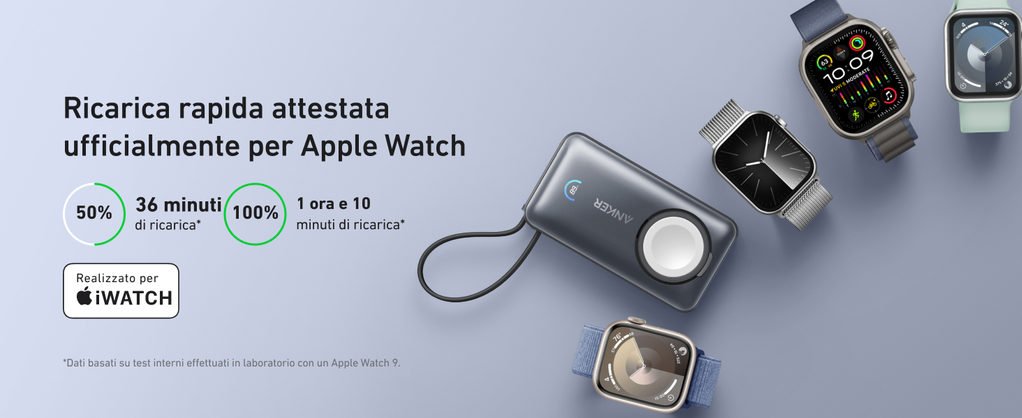 - Certificato ufficialmente per Apple Watch: Massimizza l'efficienza della ricarica con il nostro power bank certificato Apple. Ricarica un Apple Watch 9 da 0 a 47% in soli 30 minuti.