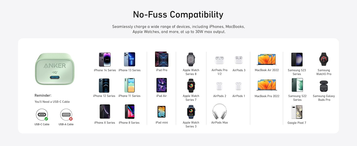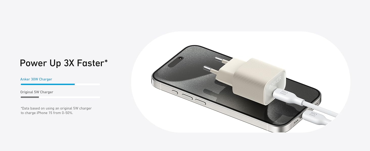 - Cosa offriamo: caricabatterie da muro Anker Nano USB-C (30 W), guida di benvenuto, la nostra garanzia di 24 mesi senza preoccupazioni e un servizio clienti cordiale.