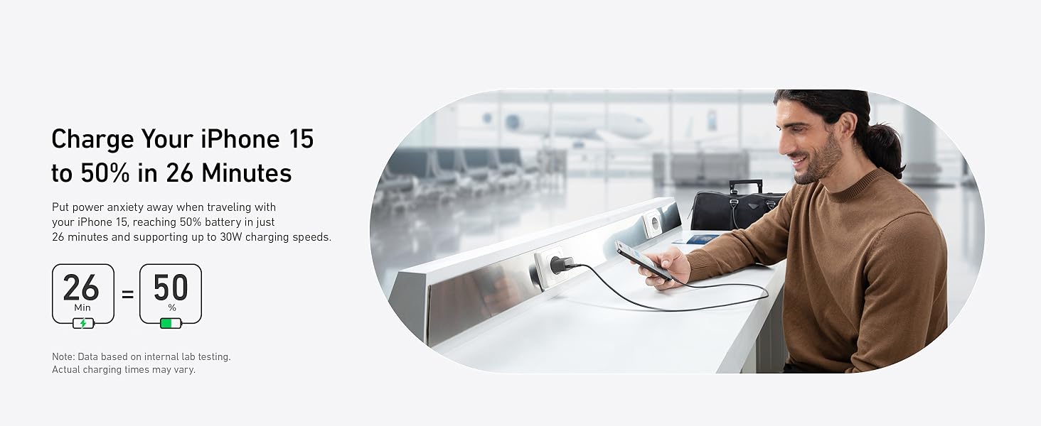 - Ricarica da 30 W ad alta velocità: scatena la potenza di una ricarica 3 volte superiore per rendere l'iPhone 15 pronto all'uso con una carica del 50% in soli 26 minuti.