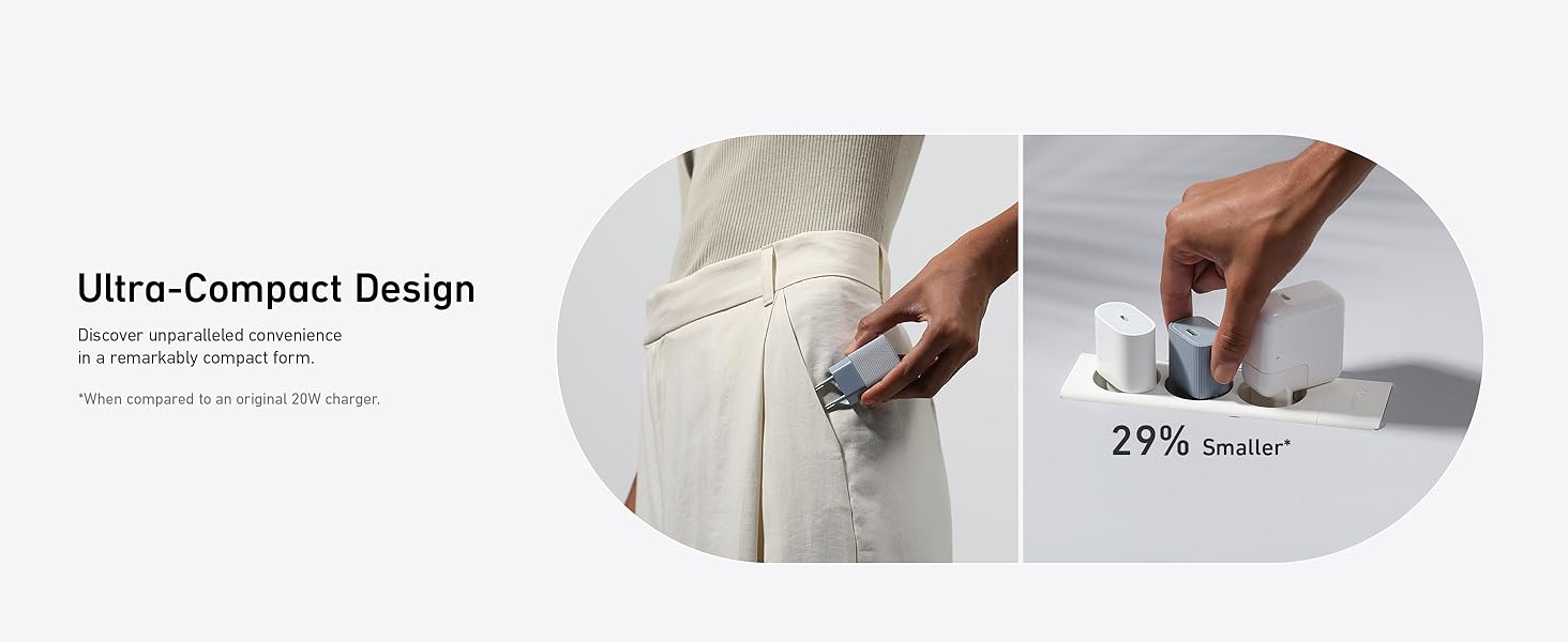 - Compatto e portatile: porta con te la carica grazie a un caricabatterie più piccolo del 29% rispetto al modello originale da 20 W e dotato di tecnologia GaN.