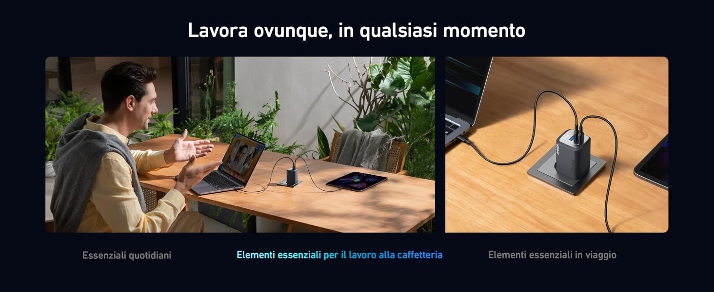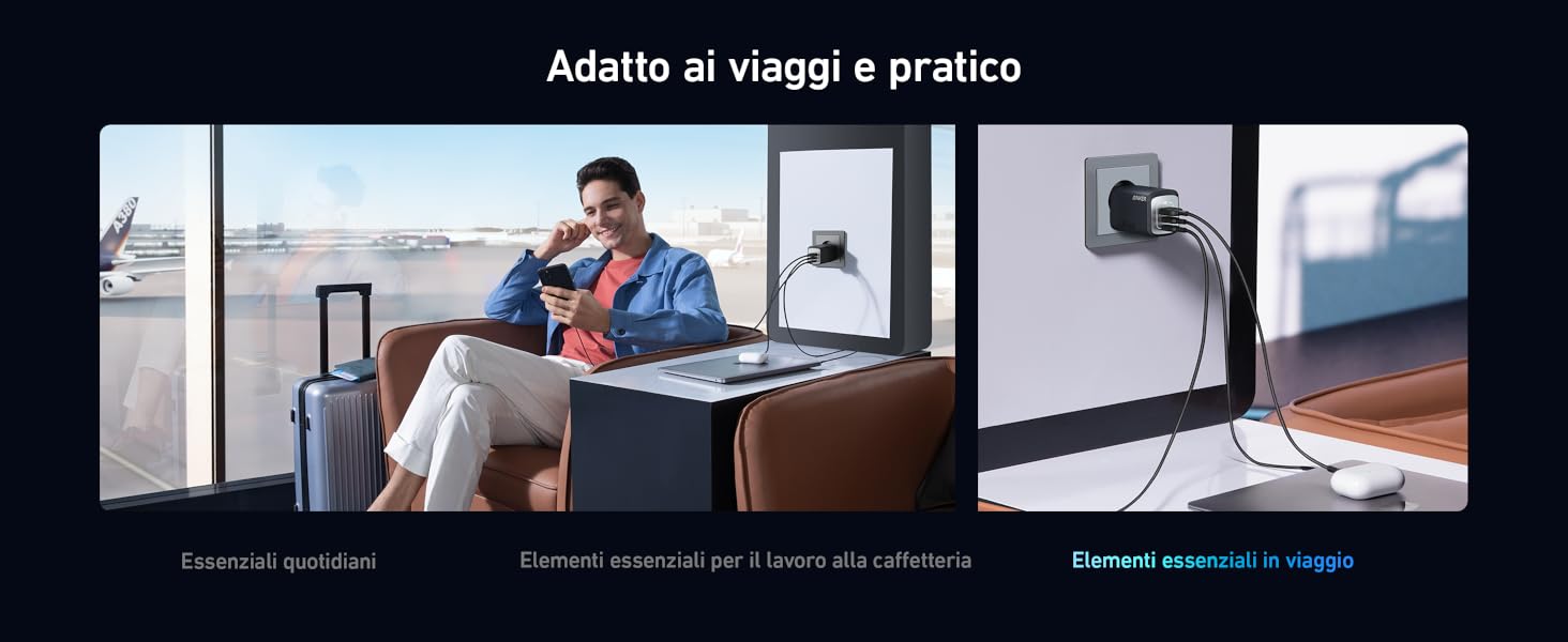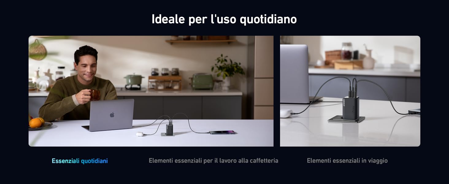 - Ricarica rapida per 3 dispositivi: con 2 porte USB-C e 1 porta USB-A, ti permette di caricare facilmente il telefono, il tablet e il notebook da un unico caricabatterie.