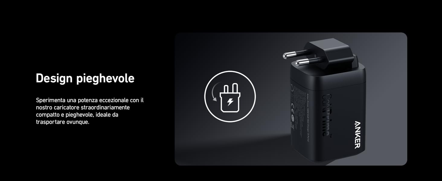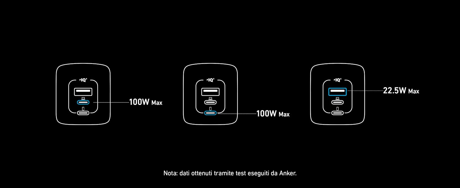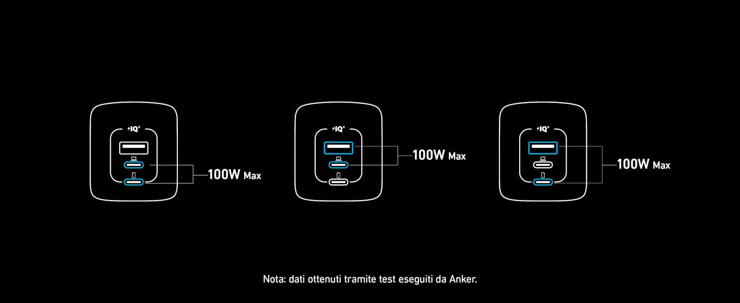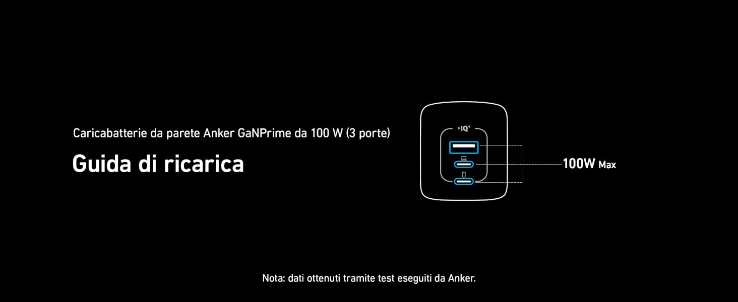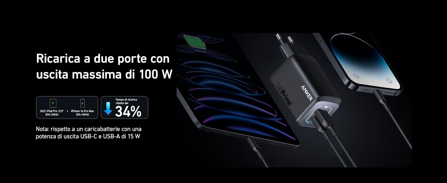 - Ricarica a due porte da 100 W max: sia che utilizzi entrambe le porte USB-C o una combinazione di porte USB-C e USB-A, goditi una ricarica rapida ed efficiente con una potenza massima di 100 W.