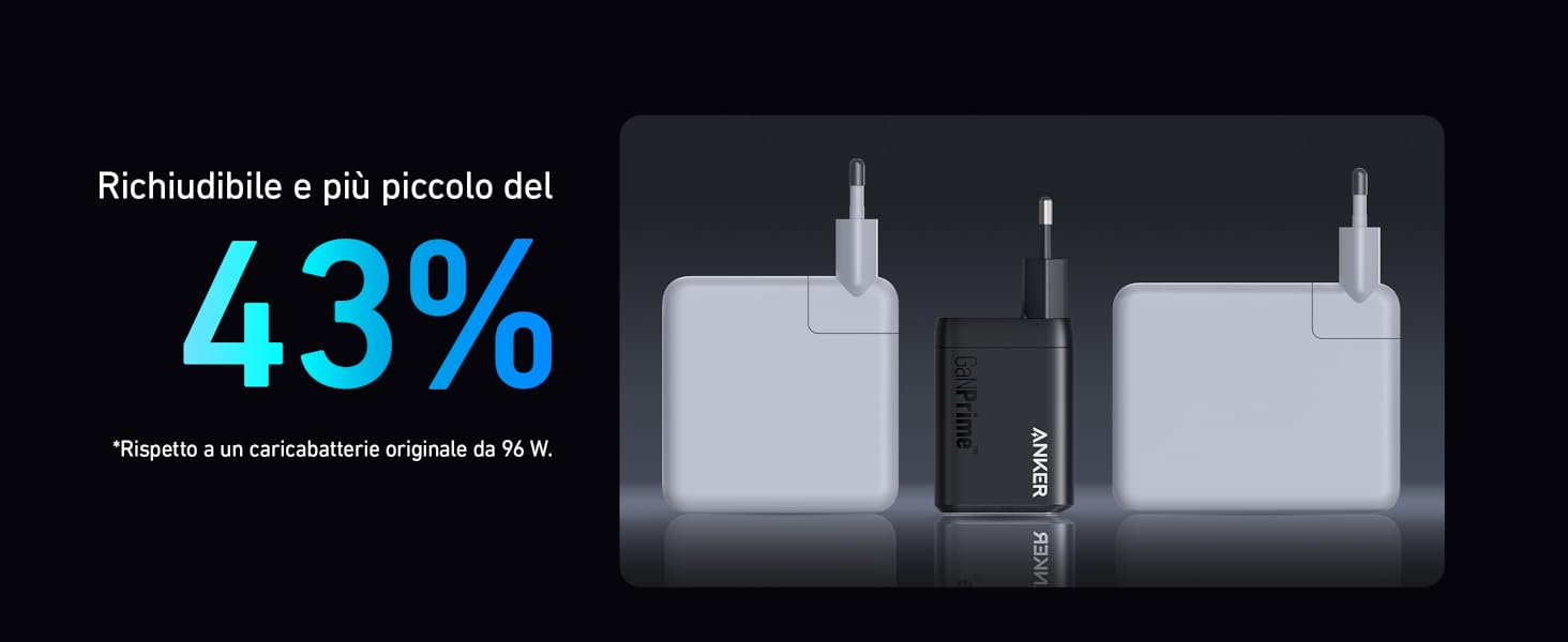 - Richiudibile e ultra compatto: prova una potenza eccezionale in un caricabatterie straordinariamente compatto e pieghevole, più piccolo del 45% rispetto al caricabatterie MacBook originale da 96 W, ideale da portare ovunque tu vada.