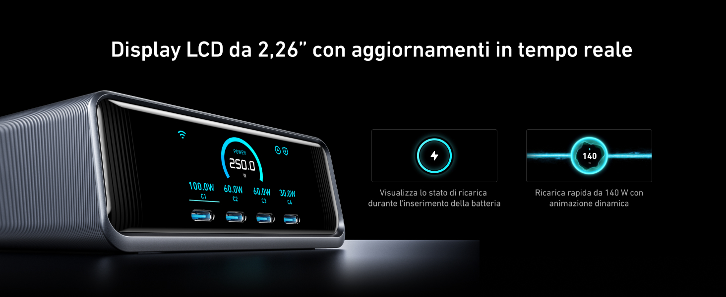 - Informazioni in tempo reale: Monitora la ricarica in tempo reale con il display LCD da 2,26", che ti permette di visualizzare lo stato e la velocità di ricarica.