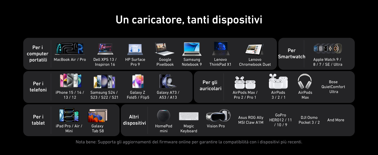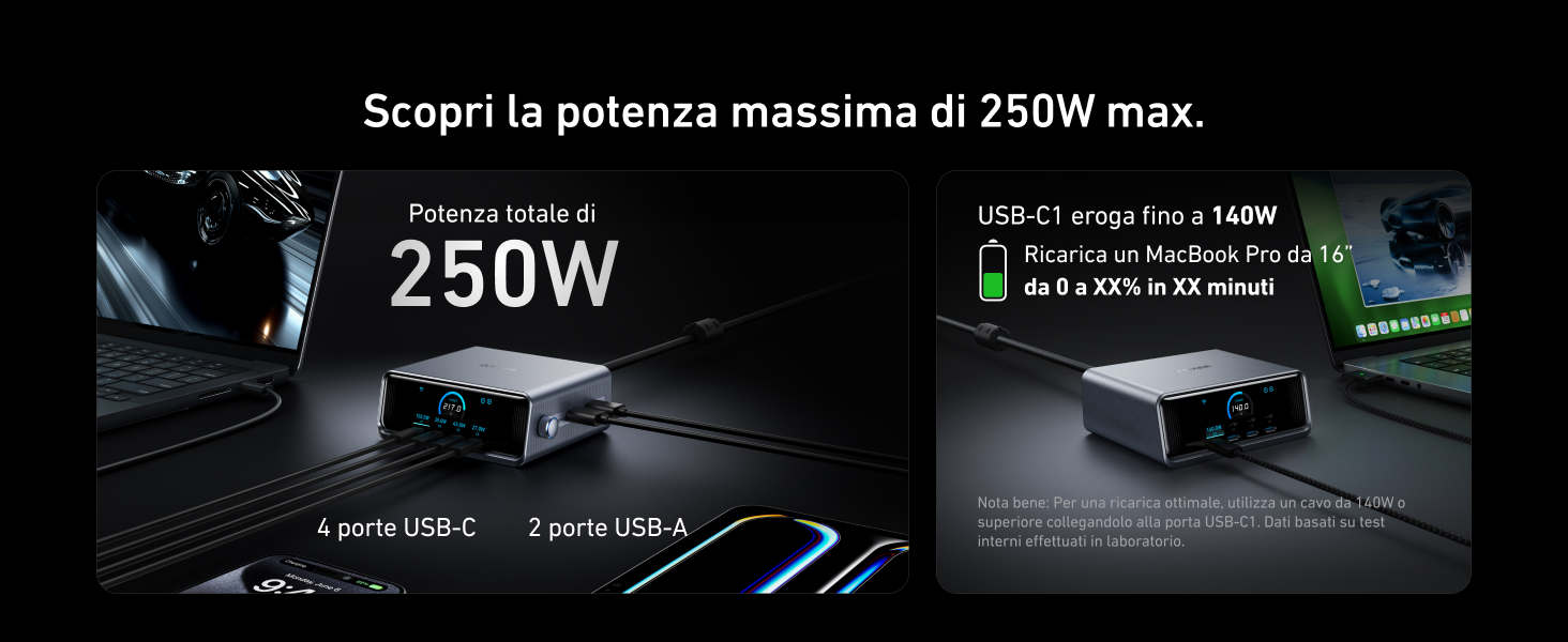 - Uscita super veloce da 250W: Scopri la comodità di una ricarica ad alta capacità con il nostro caricatore da scrivania da 250W, con quattro porte USB-C e due USB-A per alimentare contemporaneamente i dispositivi essenziali.