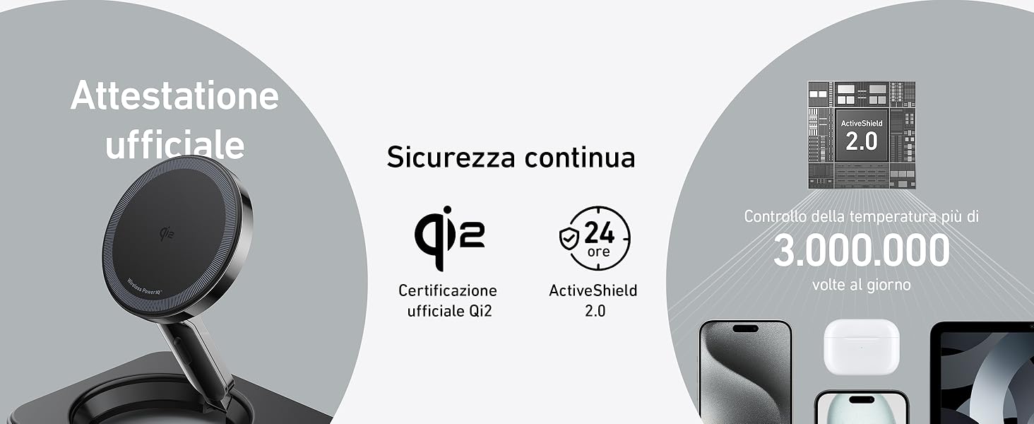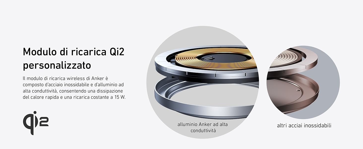 - Ricarica Certificata Qi2: Ottieni sessioni di rica sicuree ultra-rapide con 15W di potenza grazie alla certificazione Qi2 e lascia alle spalle tutte letue preoccupazioni di ricarica.