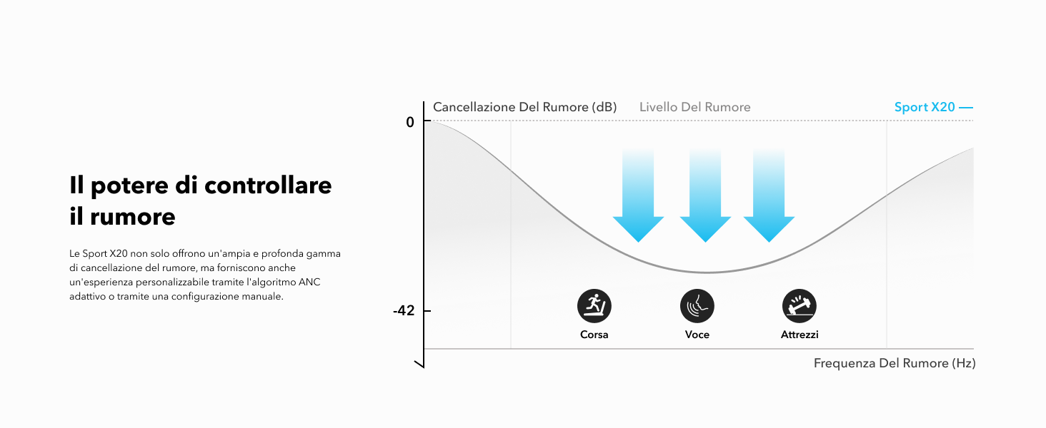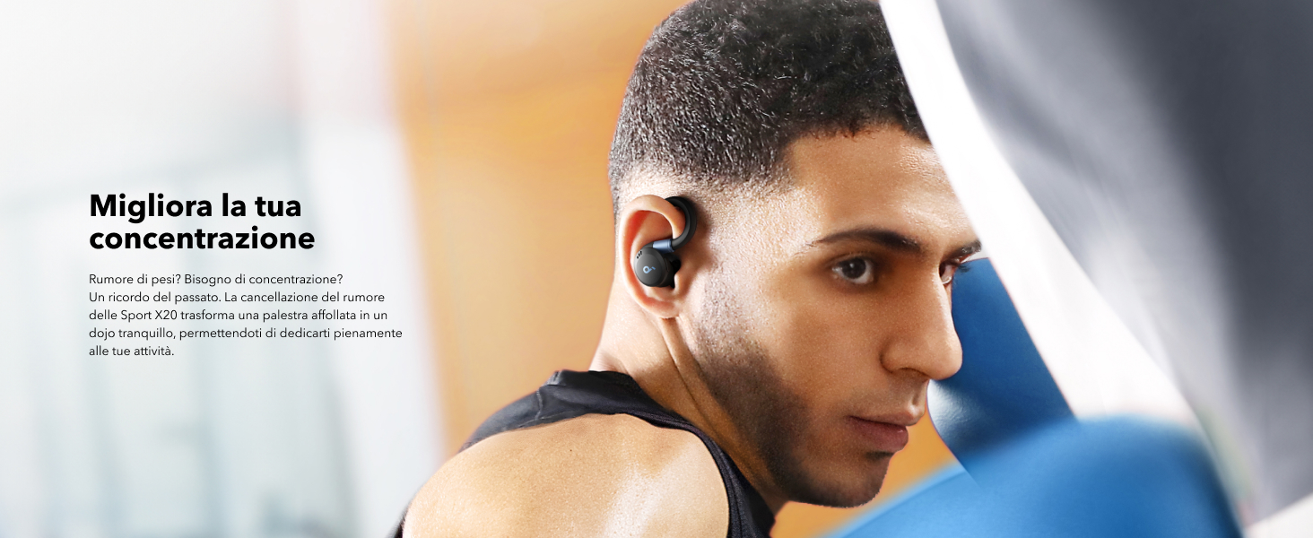 - Concentrati di più: gli auricolari sportivi Sport X20 offrono una potente cancellazione del rumore, trasformando le palestre rumorose in luoghi tranquilli. Blocca i suoni che distraggono, dal rumore dei pesi ai grugniti più forti. La regolazione manuale e l'ANC adattivo ti aiutano a concentrarti sui tuoi obiettivi di fitness.