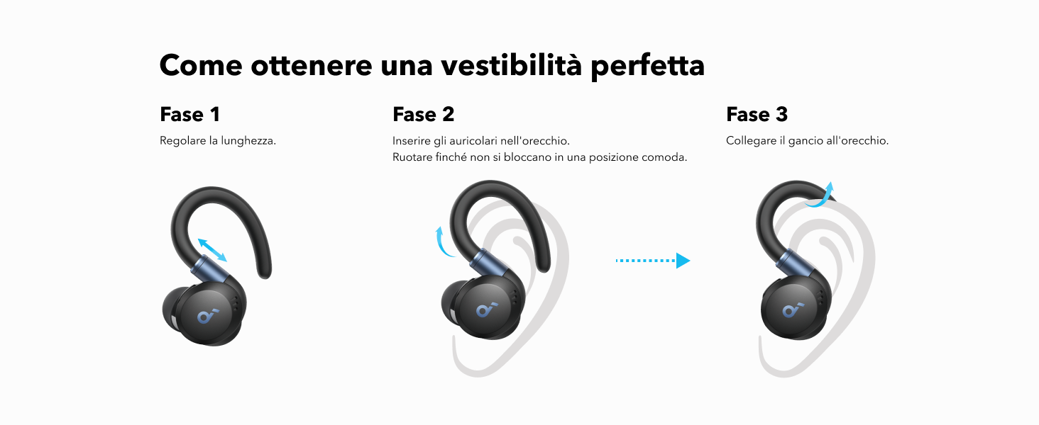Nota: i ganci auricolari non possono essere staccati, ma possono essere estratti. Hanno 4 livelli di estensione e possono essere ruotati di più o meno 30 gradi.