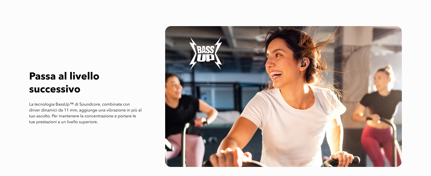 - Alza i bassi : vivi l'emozione pulsante della tecnologia BassUp di Soundcore, alimentata da potenti driver dinamici da 11 mm. Porta la tua esperienza audio a un nuovo livello e la tua motivazione a un livello superiore.