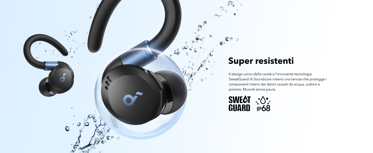 - Design a prova di tutto : l'esclusivo design a cavità degli auricolari sportivi e l'esclusiva tecnologia SweatGuard di Soundcore creano una tenuta ispirata a quella dei sottomarini che protegge i componenti interni da danni causati da acqua, sudore e polvere. Muoviti senza paura.
