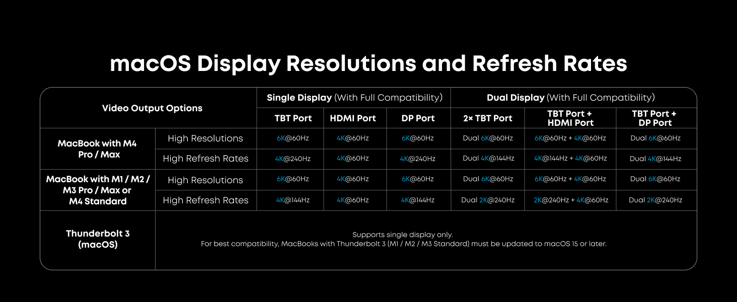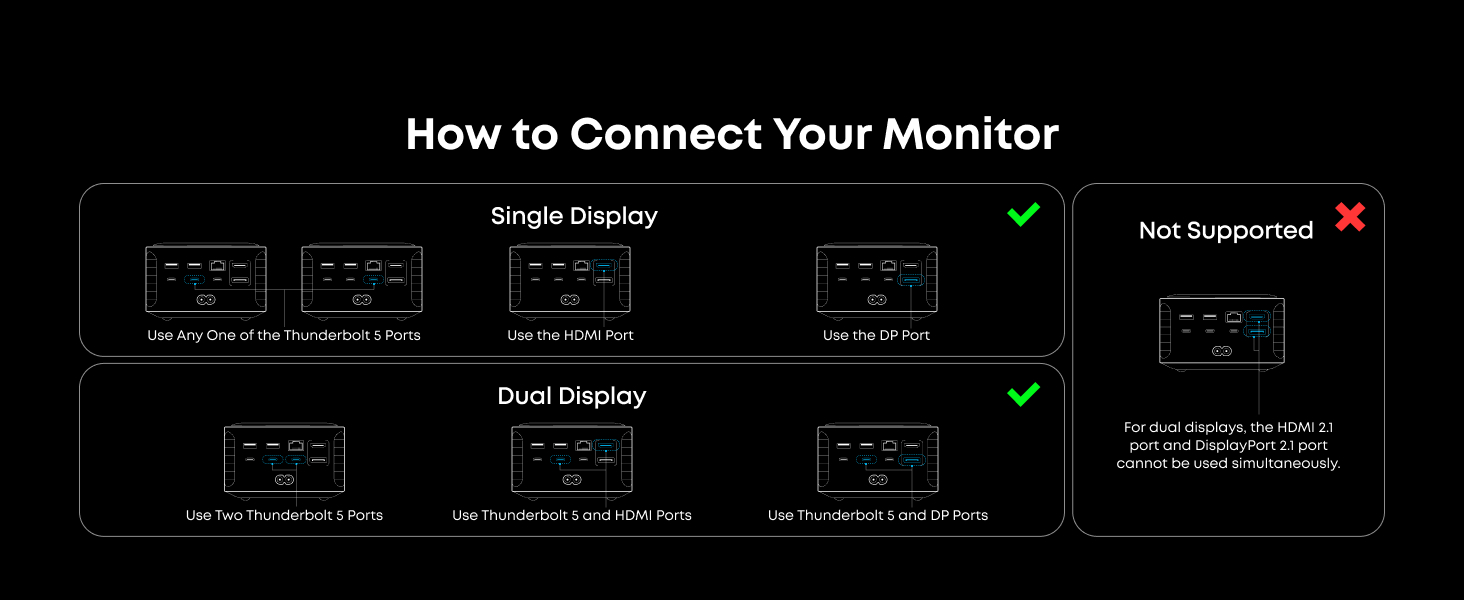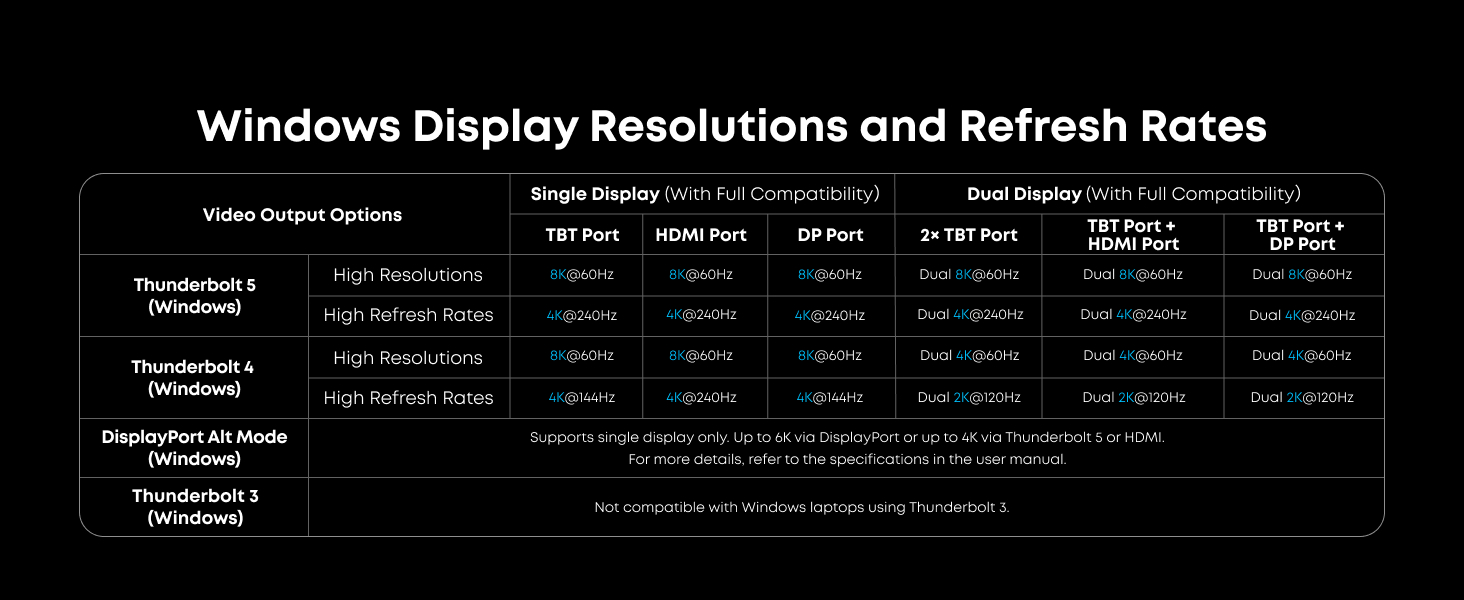 - Docking Station per doppio display : supporta un'uscita HDMI o DisplayPort e due uscite video downstream Thunderbolt 5. Supporta fino a 8K a 60 Hz per un singolo display o due uscite 8K a 60 Hz per laptop Windows Thunderbolt 5.