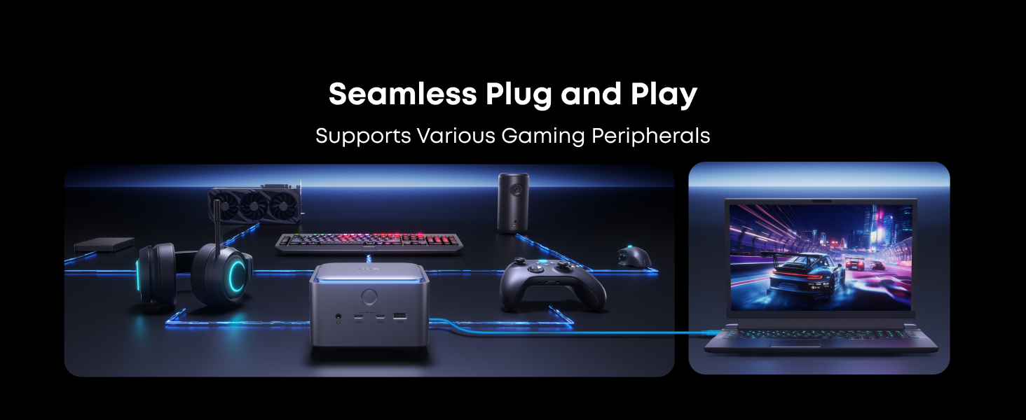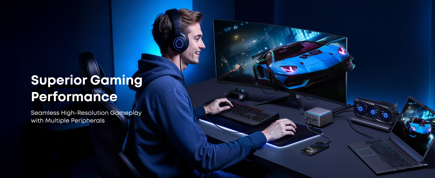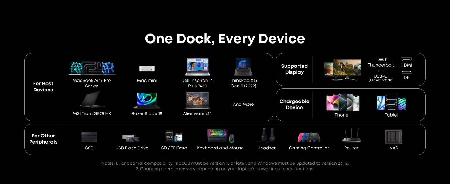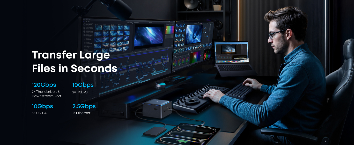 - Dock Thunderbolt 5 14 in 1 : dotato di una porta Thunderbolt 5 upstream, due porte Thunderbolt 5 downstream, due porte USB-C, tre porte USB-A, lettori di schede SD e TF, un ingresso CA, una porta Ethernet da 2,5 Gbps, un jack audio e una porta HDMI 2.1 o DisplayPort 2.1. Include inoltre un avanzato sistema di raffreddamento attivo per prestazioni ottimali anche a pieno carico, prevenendo il surriscaldamento.
