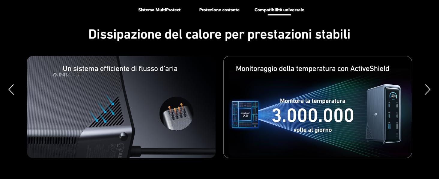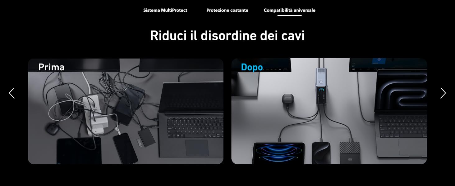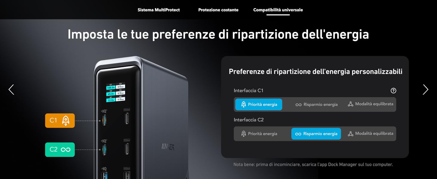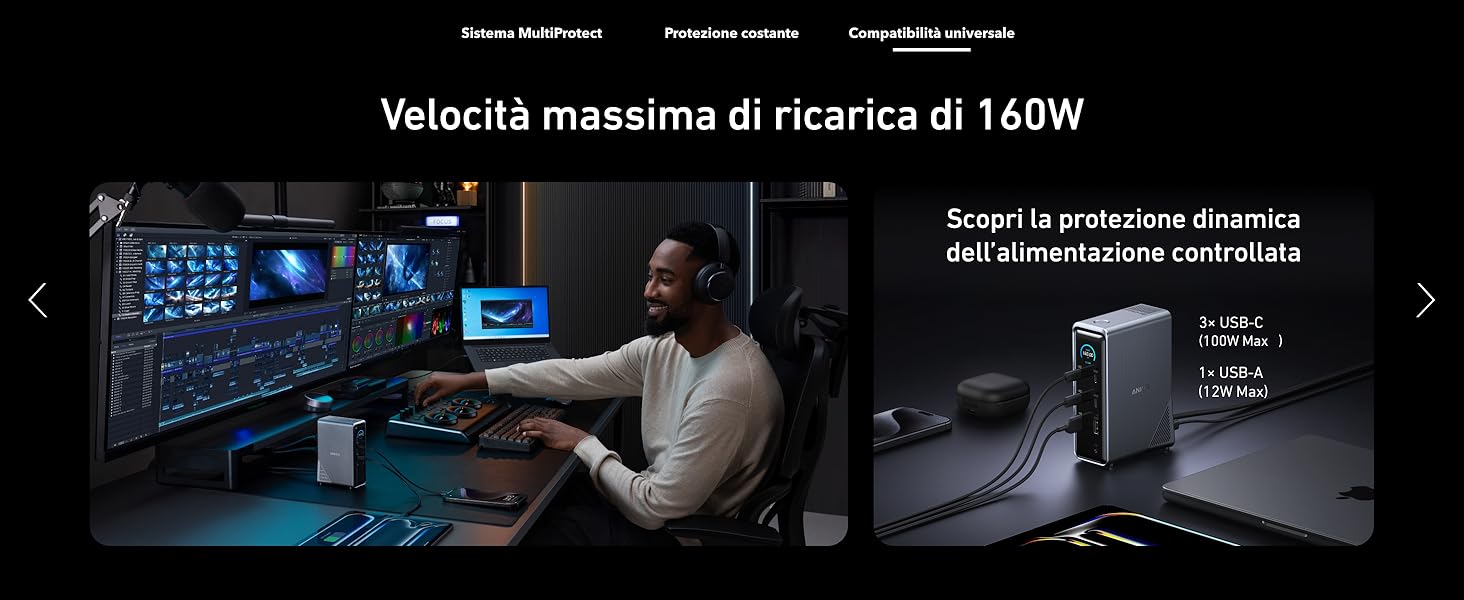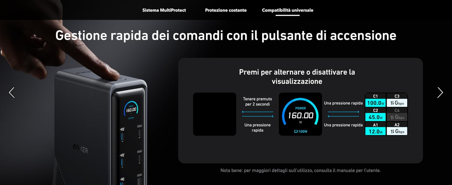 - Stazione di docking ultraveloce: fornisce una carica potente con 160 W di potenza in uscita totale, in grado di caricare fino a quattro dispositivi contemporaneamente tramite tre porte USB-C da 100 W max ciascuna e una porta USB-A da 12 W max.