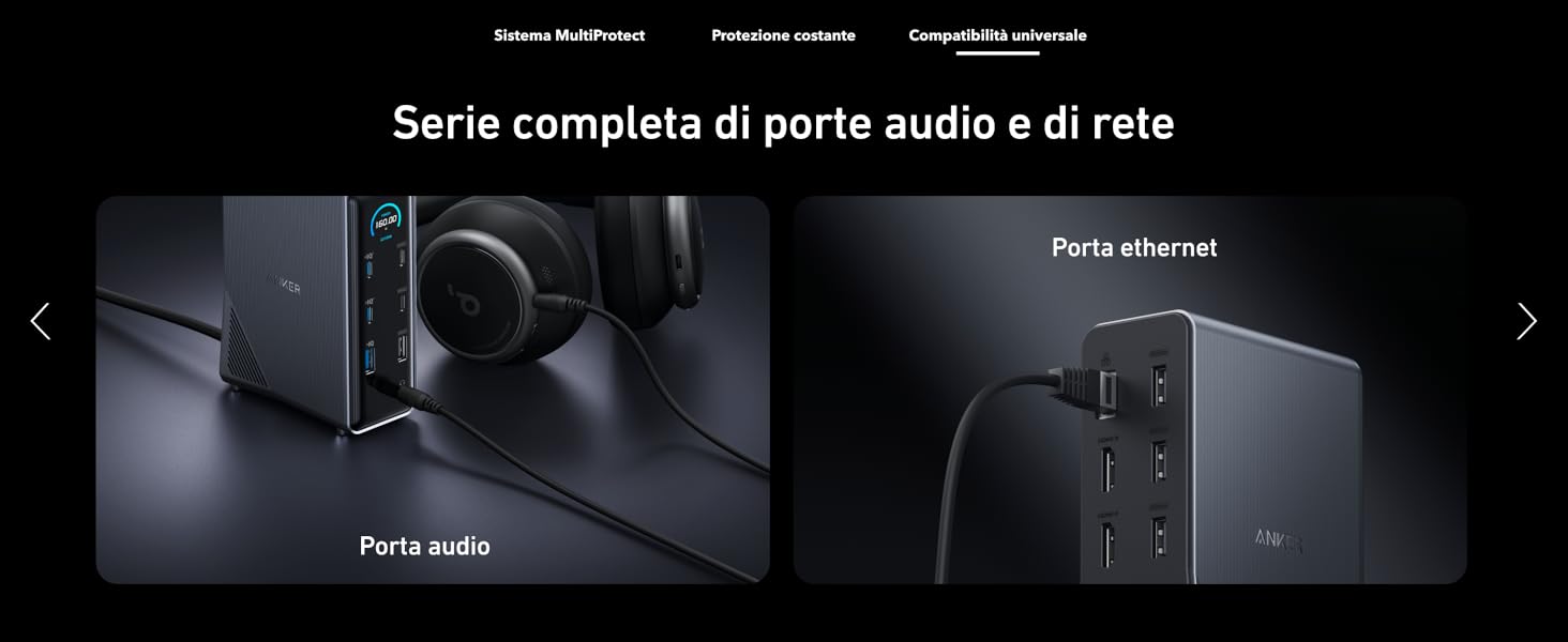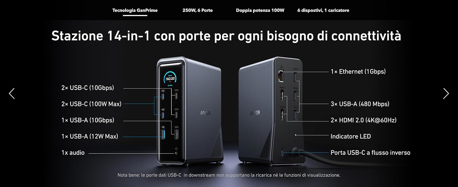 - Cosa riceverai: Anker Prime Charging Docking Station (14 in 1, doppio display, 160 W), cavo USB-C per porta upstream (1 m, 100 W, 10 Gbps), guida di benvenuto, garanzia di 24 mesi e il nostro cordiale servizio clienti.