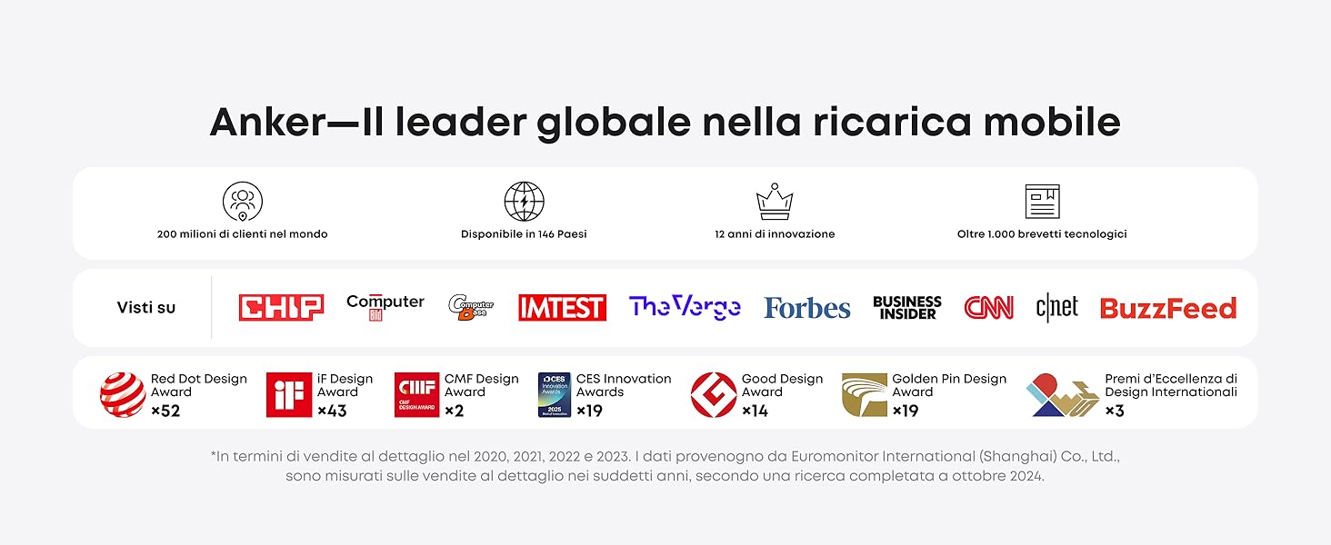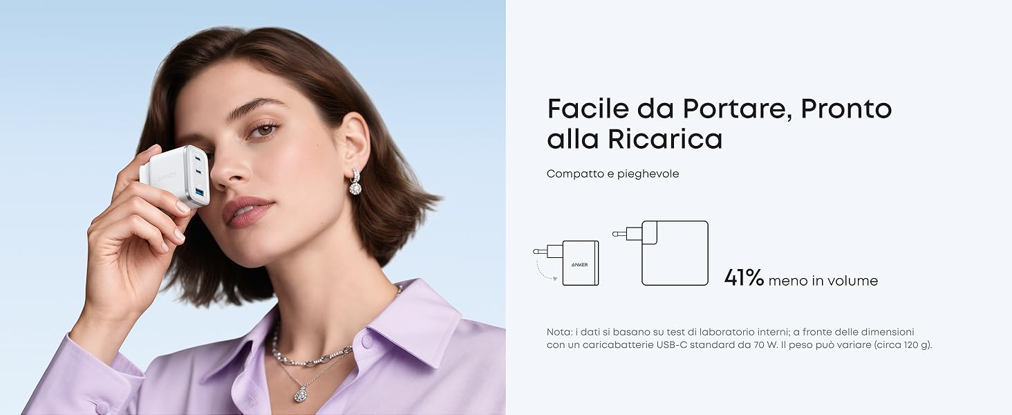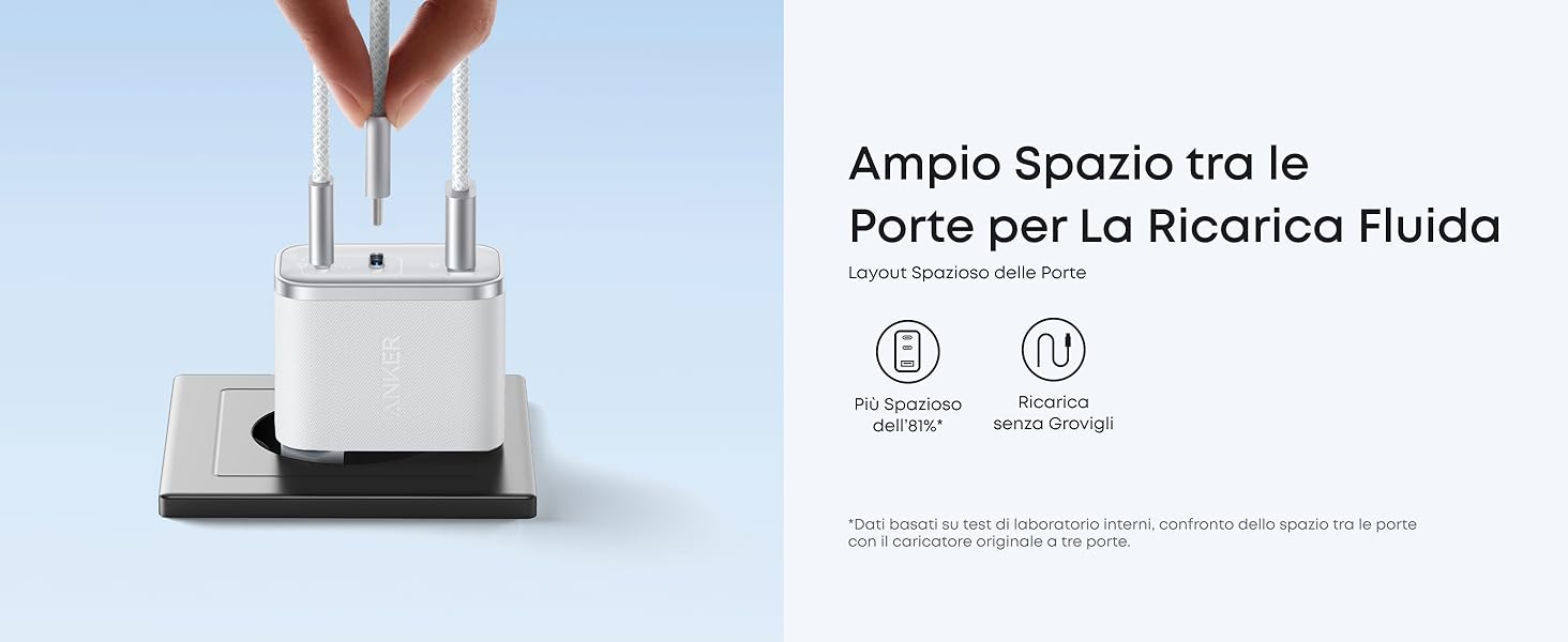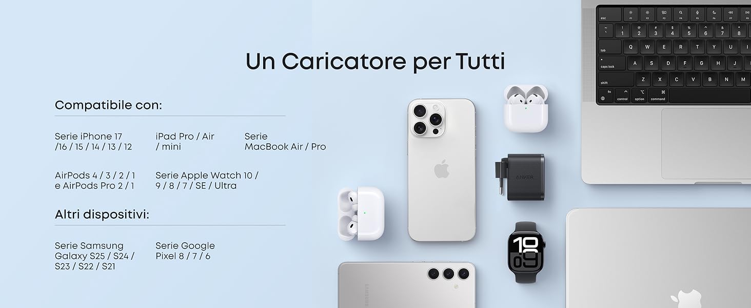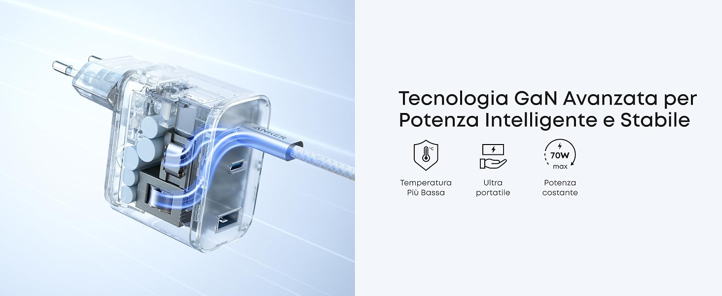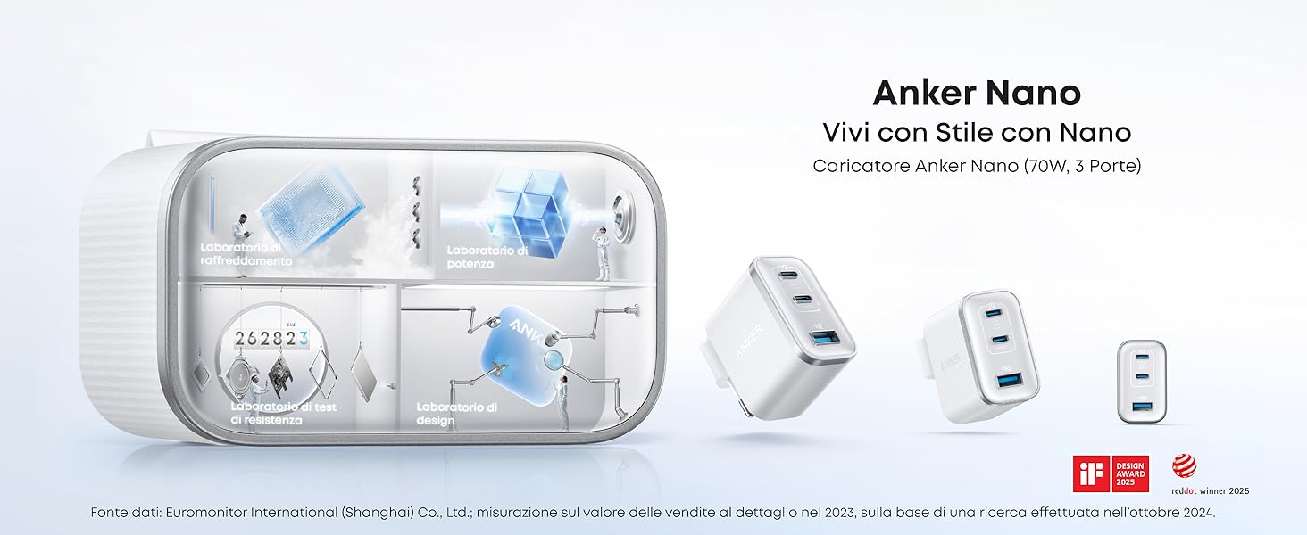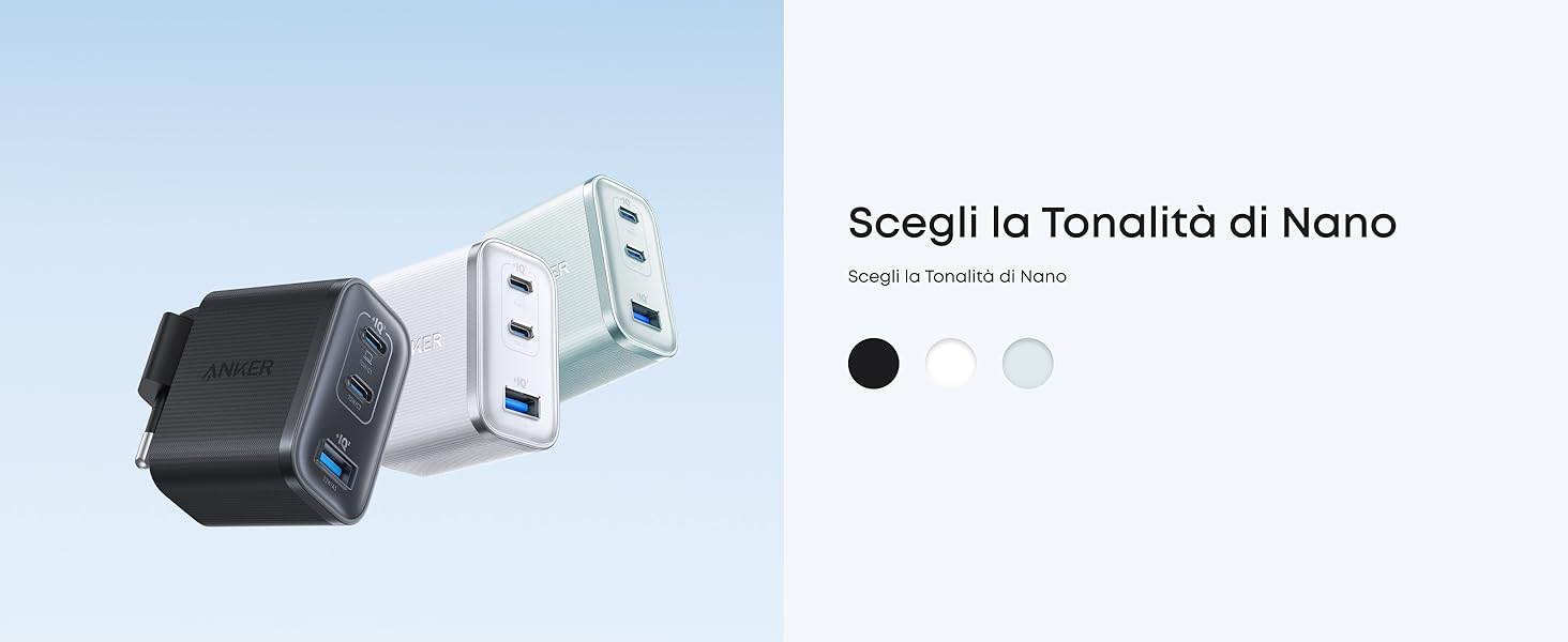 - Incluso: Caricatore Anker Nano (70W, 3 porte), guida introduttiva, garanzia di 18 mesi e assistenza clienti.