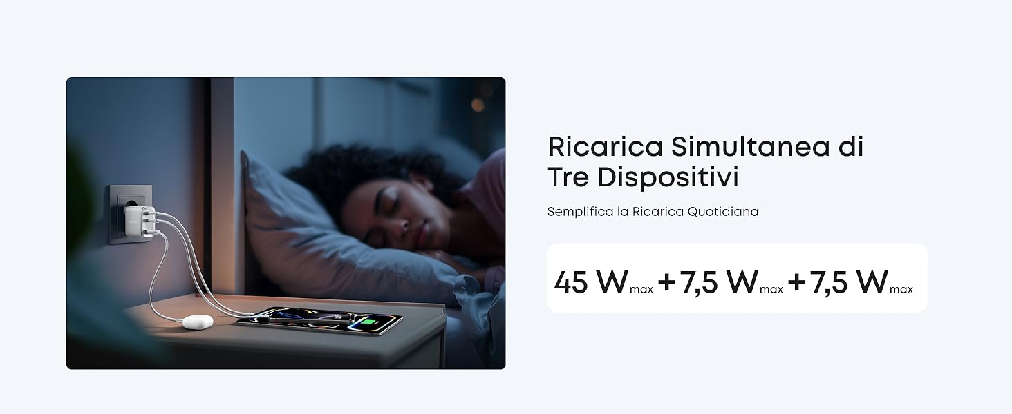 - Ricarica Rapida che Rimane Fresca: Certificazione TÜV Rheinland e monitoraggio termico ActiveShield 4.0, superficie fino a 18°C, più fresco dei caricatori convenzionali, dispositivi protetti e minore calore nella ricarica.