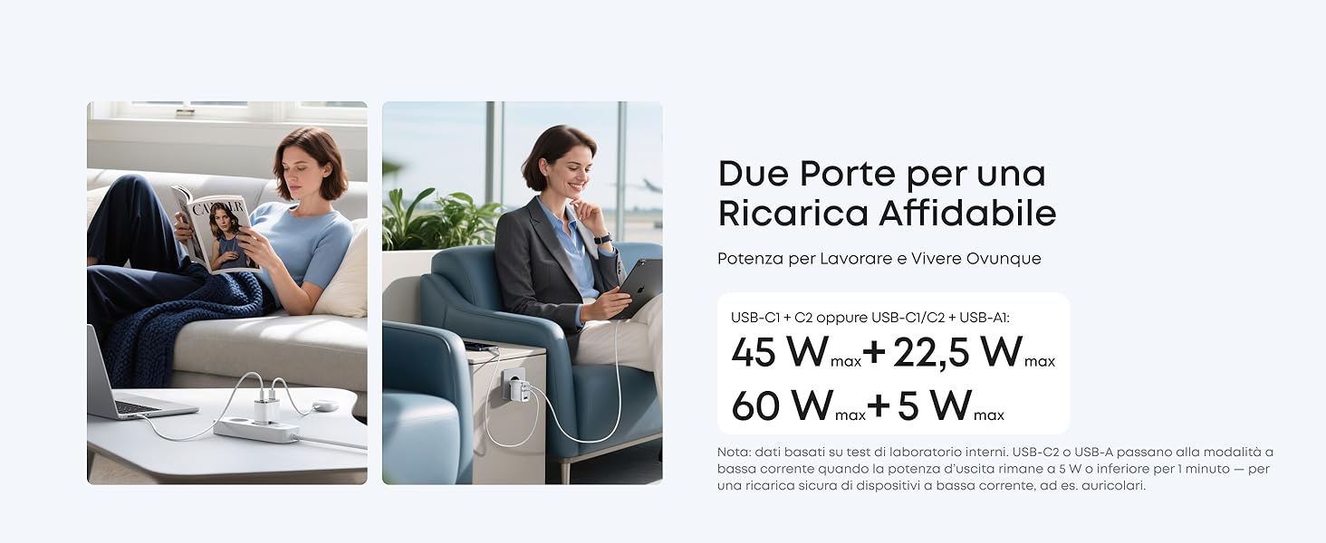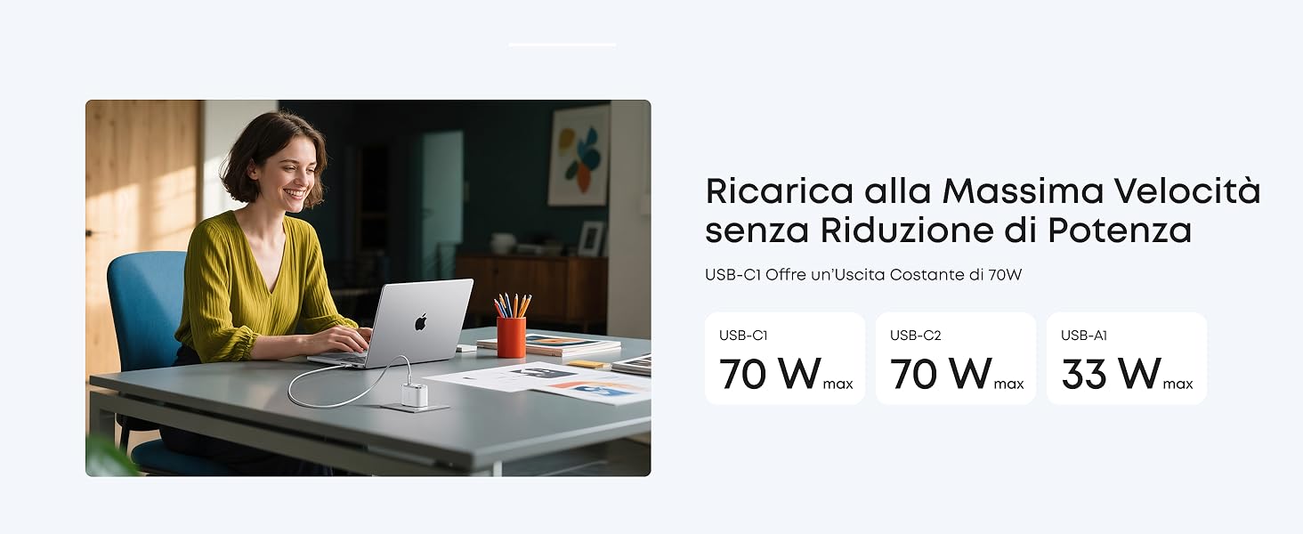 - Alimenta il Tuo MacBook a Vera Velocità 70W: Ricarica il MacBook a vera velocità 70W: ogni porta USB-C offre fino a 70W, sufficiente per ricaricare MacBook Pro 14" (2024) dallo 0 al 50% in 35 min. Opzione più compatibile con ultimi modelli M4 rispetto agli adattatori std da 65W.