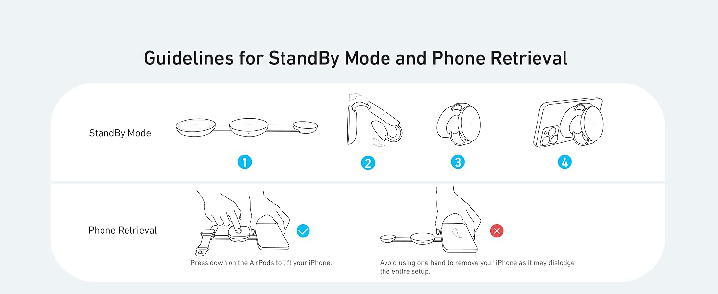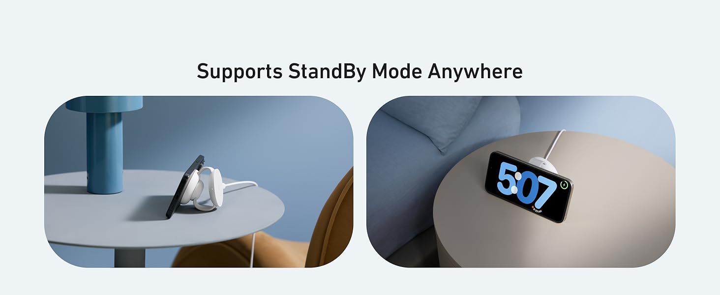 - Modalità StandBy per una migliore visualizzazione: Il nostro caricatore ti permette di posizionare l’iPhone in orizzontale e approfittare di una migliore visibilità dello schermo, inoltre supporta la modalità StandBy quando è ripiegato.