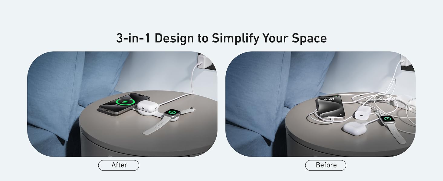- Caricatore wireless 3-in-1: Per mantenere il spazio di lavoro minimalista e sempre ordinato, il nostro caricatore wireless 3-in-1 alimenta più dispositivi contemporaneamente.