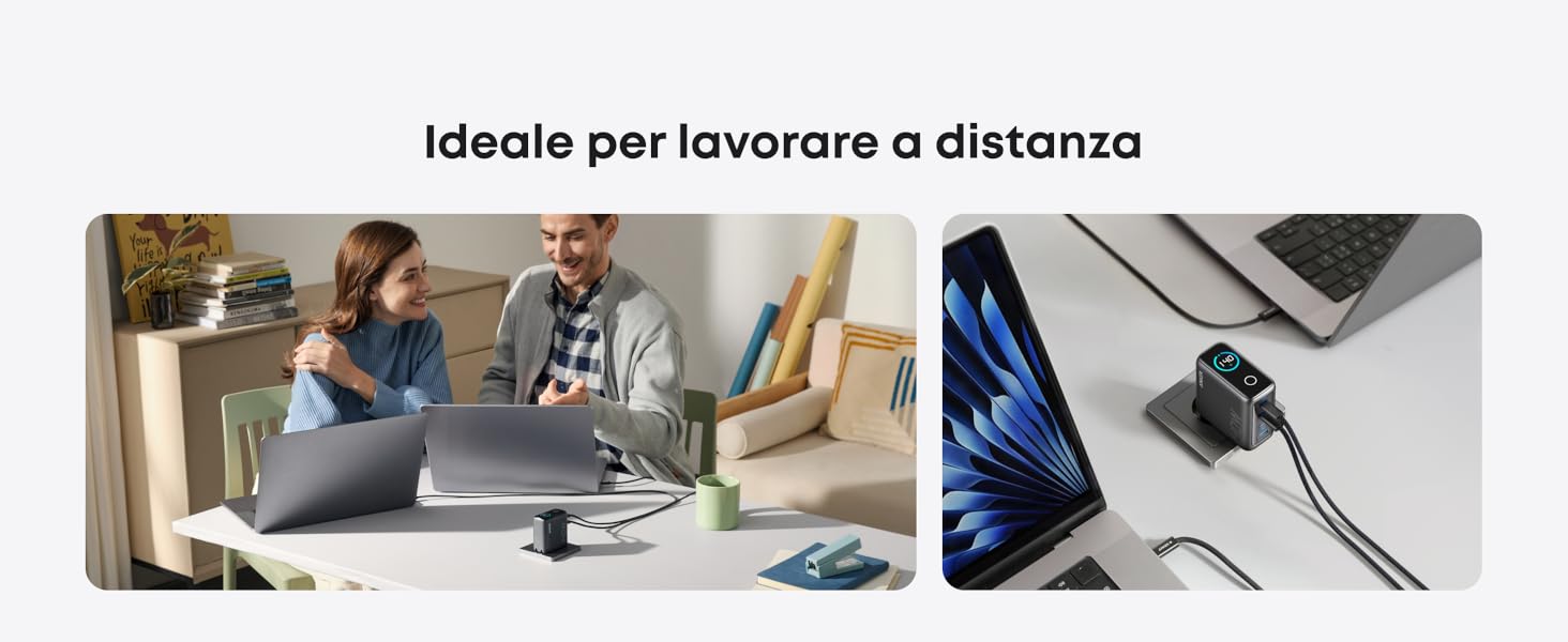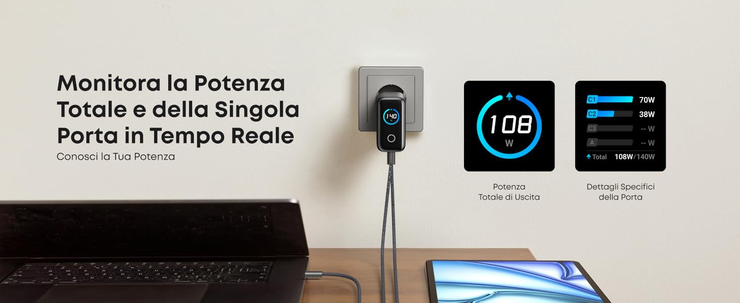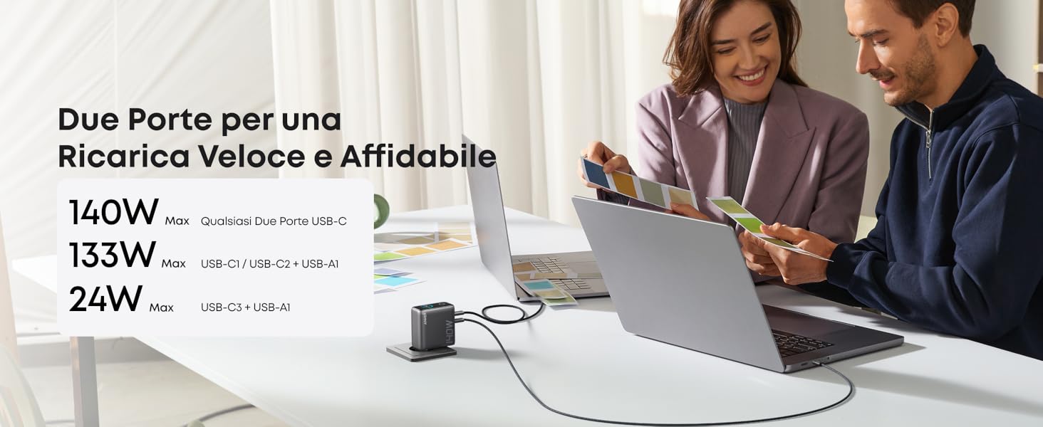 - Ricarica a 140 W fino a 4 dispositivi: La nostra tecnologia GaN all’avanguardia fornisce una ricarica rapida per 4 dispositivi contemporaneamente con 140 W di energia in uscita.