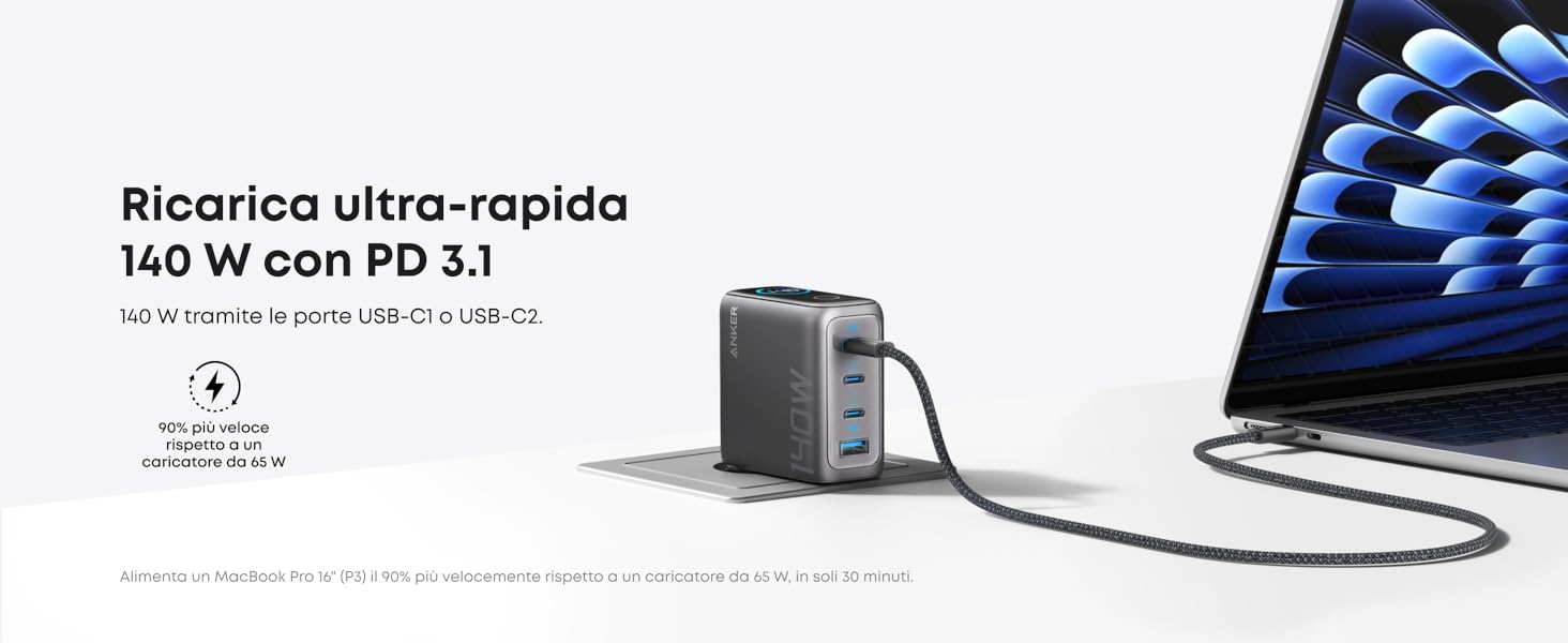 Caricabatterie Anker per laptop (140 W, 4 porte, PD 3.1) con cavo USB-C