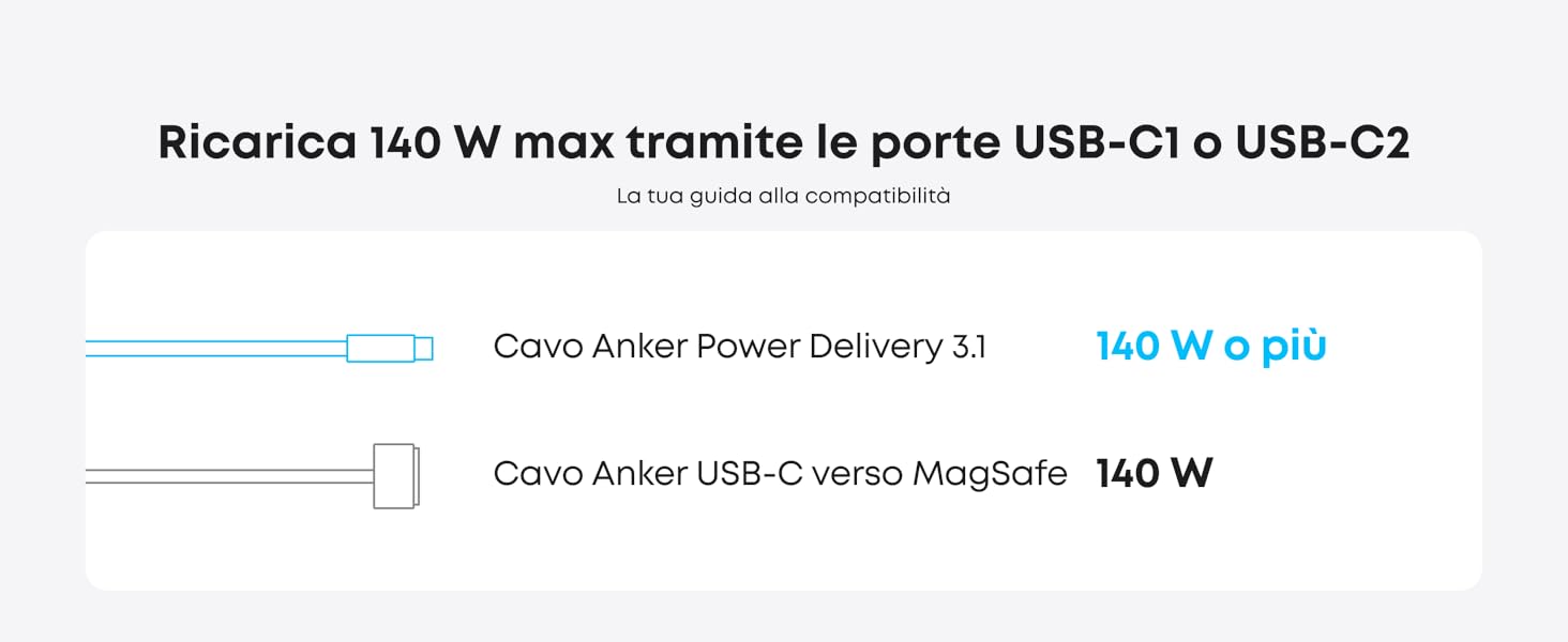 - La confezione contiene: Caricabatterie Anker Zolo (140W, 4 porte, schermo, cavo USB-C a USB-C da 240W e 1,5m, guida di benvenuto, garanzia di 18 mesi e il supporto del nostro cordiale servizio clienti.