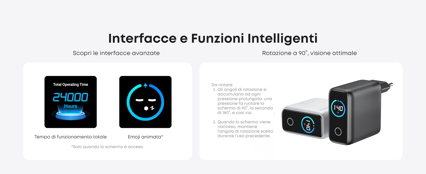 - Monitoraggio chiaro e accessibile: Il display a colori ad alta definizione offre una visione dettagliata dello stato di ricarica, della temperatura e dei dettagli delle porte, per tenerti sempre informato sullo stato dei tuoi dispositivi.