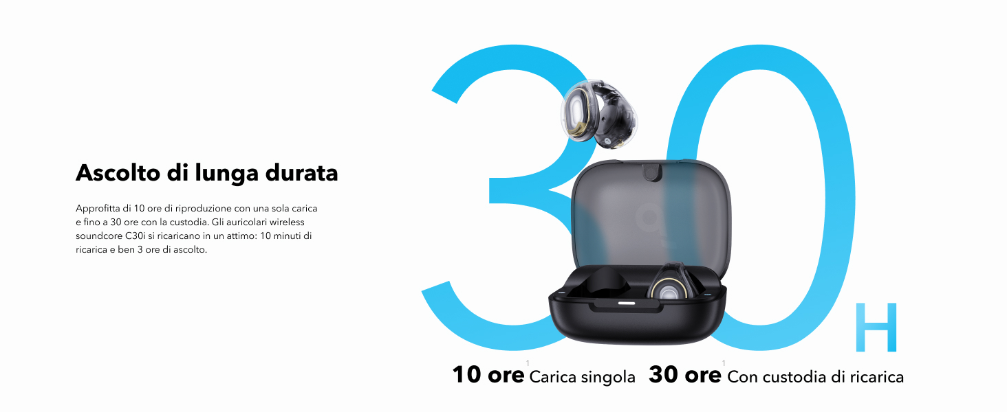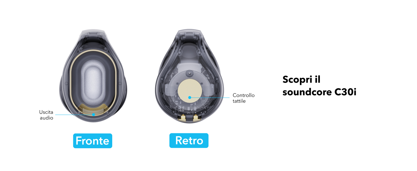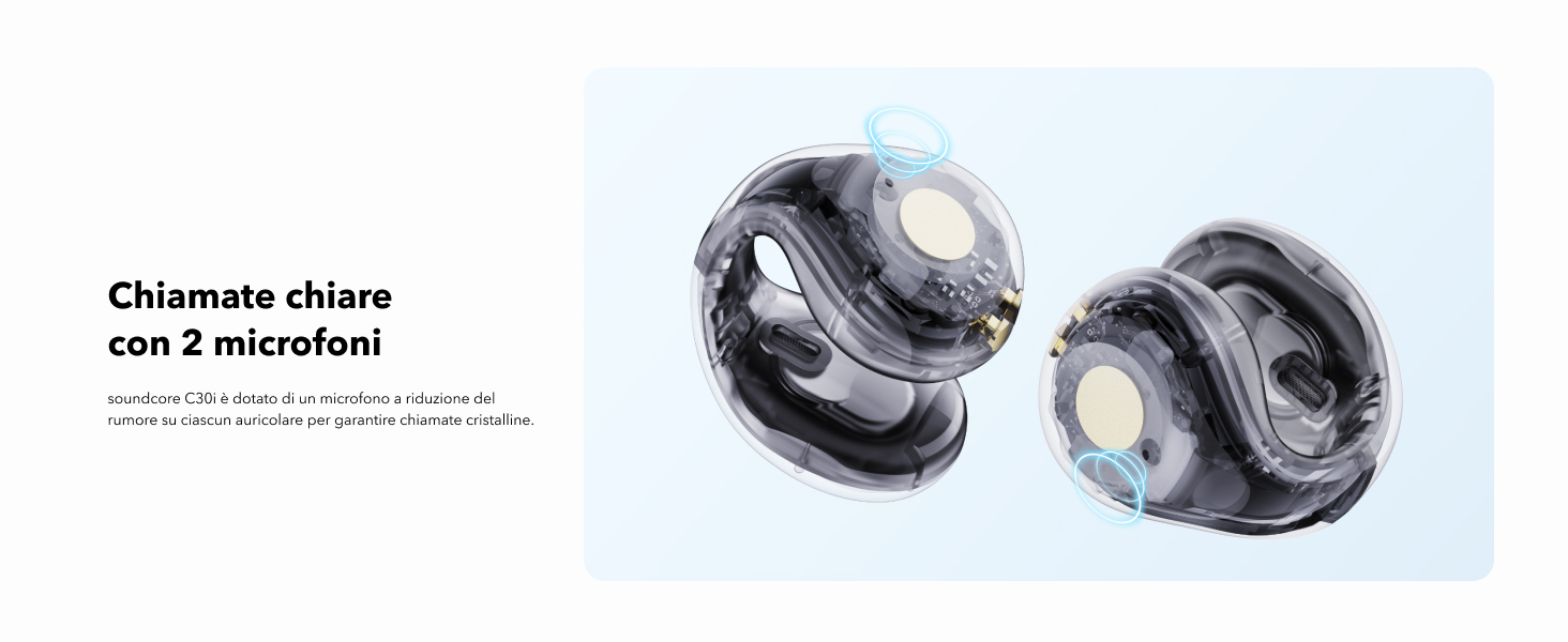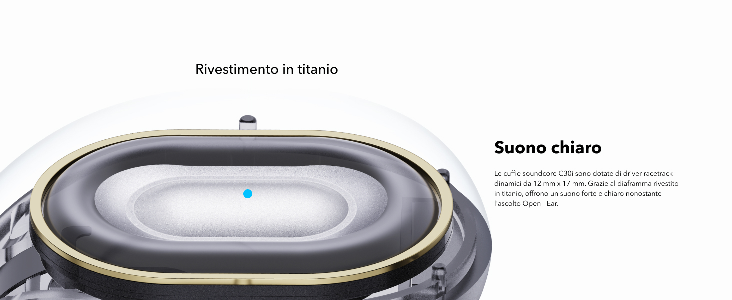 Audio nitido: le soundcore C30i vantano ampi driver racetrack da 12 mm x 17 mm. Grazie al diaframma rivestito in titanio, puoi godere di un audio nitido, anche con l'ascolto a orecchio aperto.