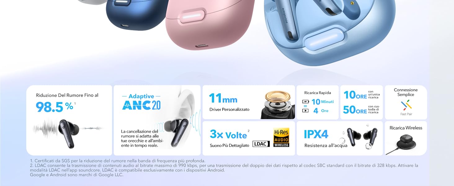 - LA CANCELLAZIONE DEL RUMORE SI ADATTA ALLE ORECCHIE E AGLI AMBIENTI: Adaptive ANC 2.0 (cancellazione adattiva del rumore 2.0) esegue calcoli e regolazioni in tempo reale in base ai canali uditivi e all'ambiente esterno, per la massima tranquillità anche in ambienti rumorosi.