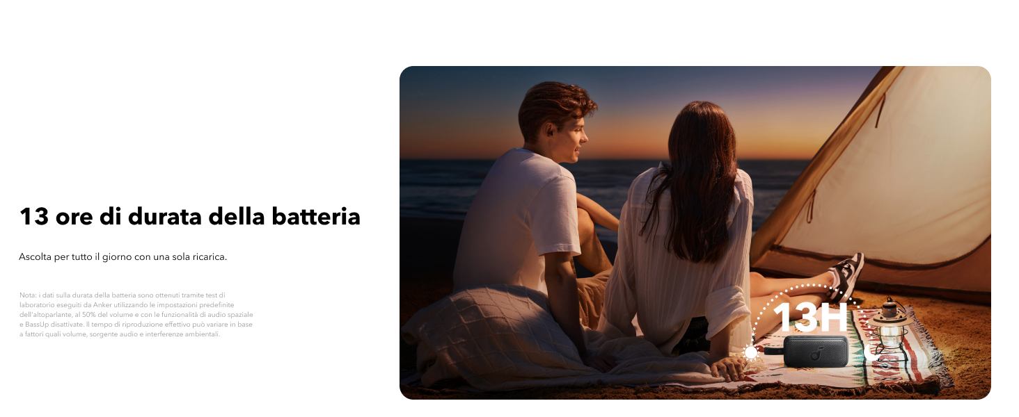 La durata della batteria di 13 ore si basa su misurazioni effettuate al 50% del volume e con la modalità bassi disattivata. La durata effettiva della batteria può variare a seconda di fattori quali il tipo di contenuto riprodotto, le impostazioni di equalizzazione personalizzate e il livello del volume.