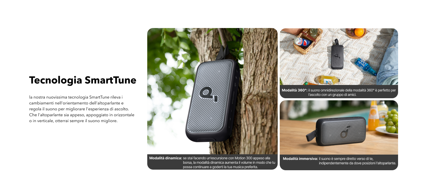 - Tecnologia SmartTune: l'esclusiva tecnologia adattiva dell'altoparlante portatile Motion 300 si adatta automaticamente alla direzione e all'orientamento dell'altoparlante per offrire il suono migliore in qualsiasi scenario.