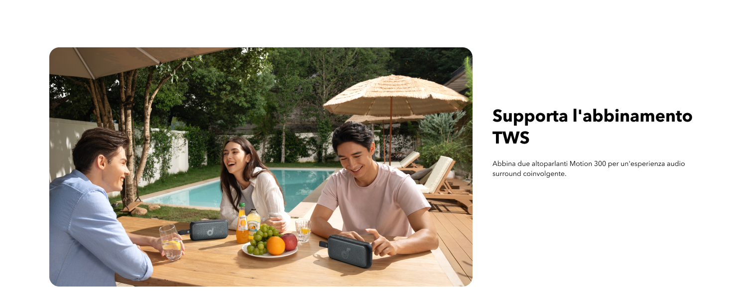 TWS sta per True Wireless Stereo e consente a due altoparlanti identici di riprodurre audio stereo dopo l'associazione. Motion 300 supporta TWS.