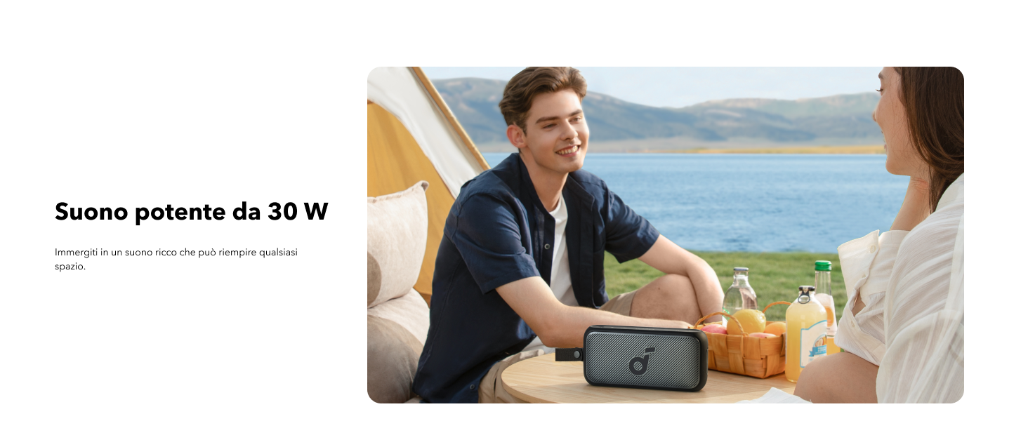 - Suono potente, design portatile: con un potente suono stereo da 30 W nel palmo della tua mano, non dovrai rinunciare alla qualità del suono quando sei in movimento.