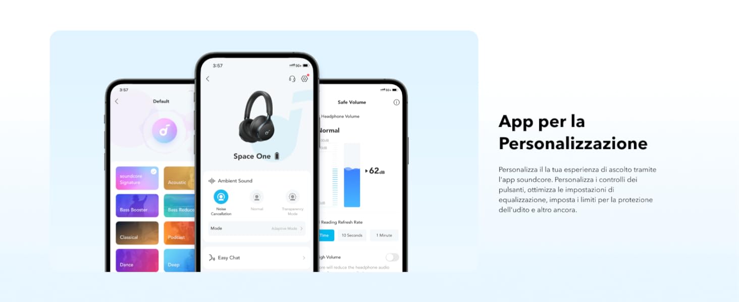1. Space One imposta automaticamente l'ANC predefinito e i livelli di Trasparenza sono entrambi impostati su 5. Questi livelli possono essere regolati tramite l'app Soundcore in base alle preferenze personali.