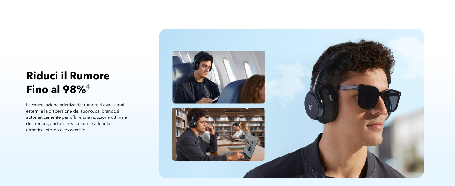 - RIDUCI IL RUMORE FINO AL 98%*: la cancellazione adattiva del rumore rileva i suoni esterni e le dispersioni del suono, calibrandosi automaticamente per offrire una riduzione del rumore ottimale. Elimina le distrazioni indesiderate, su un treno rumoroso, in un bar affollato o a causa di un posizionamento non corretto delle cuffie. *Test effettuato da soundcore in condizioni di laboratorio.
