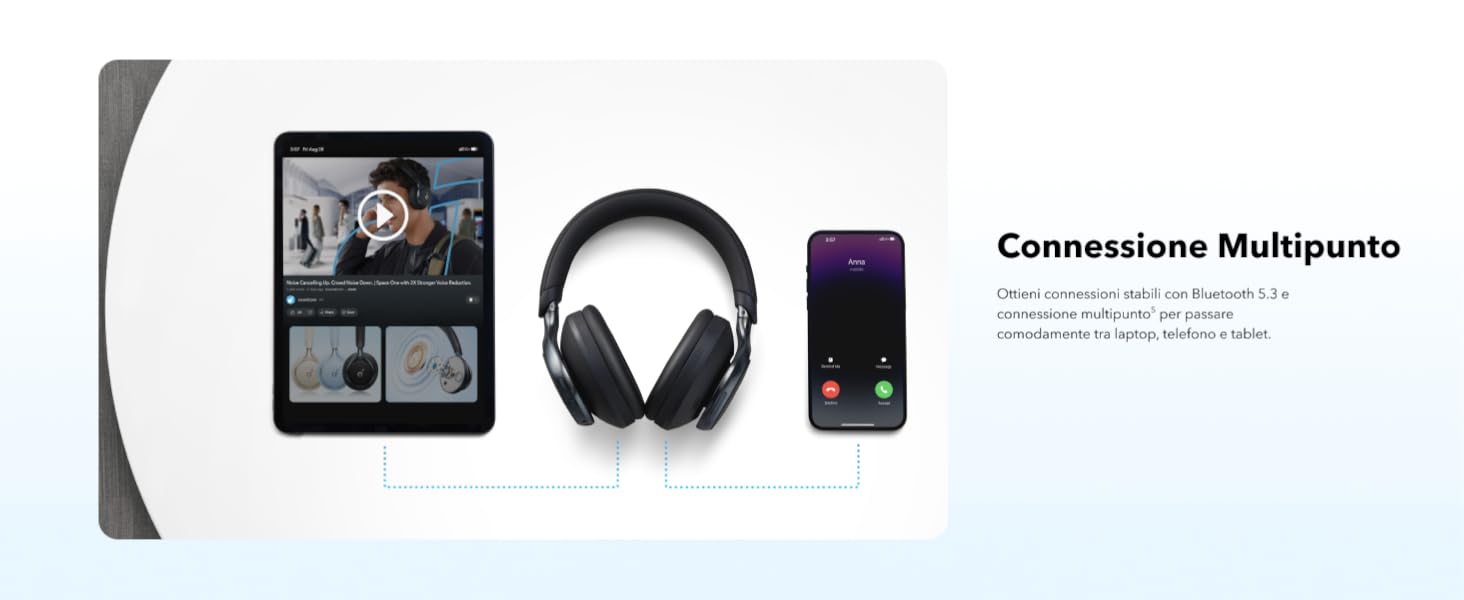 2. La connessione multipoint è abilitata automaticamente. Per modificare questa impostazione, collegare le cuffie Space One all'app Soundcore e selezionare Space One dall'elenco dei dispositivi. Da qui, è possibile disattivare manualmente la connessione multipoint dal menu delle impostazioni.