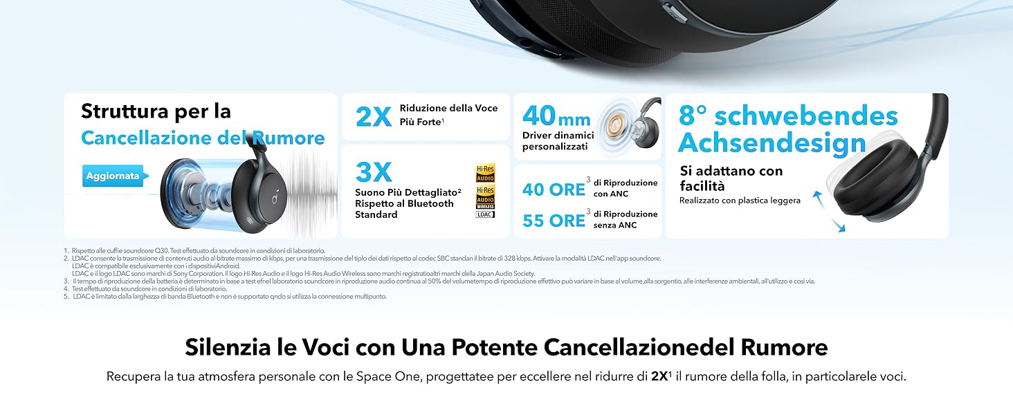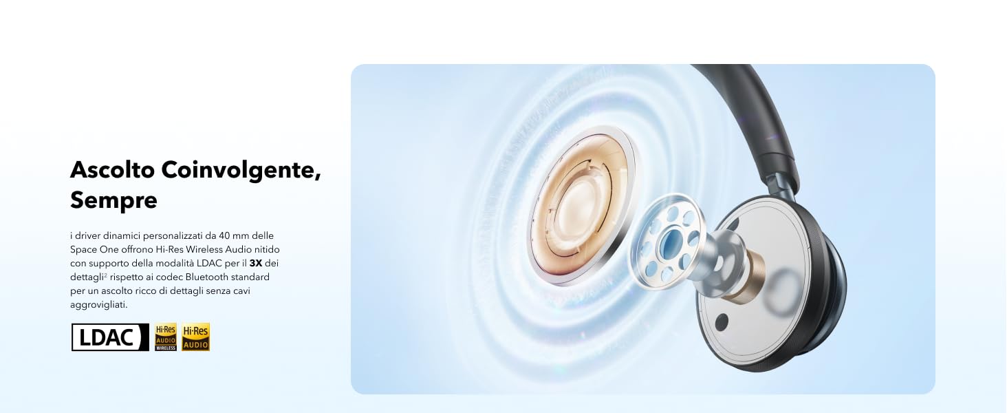 - IN VIAGGIO CON HI-RES AUDIO: i driver dinamici personalizzati da 40 mm delle Space One supportano la modalità LDAC per Hi-Res Wireless Audio e offrono il triplo dei dettagli rispetto ai codec Bluetooth standard per un ascolto ricco di dettagli senza cavi aggrovigliati.
